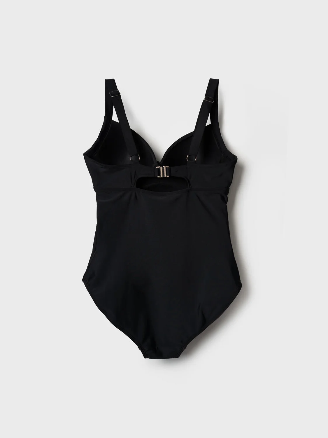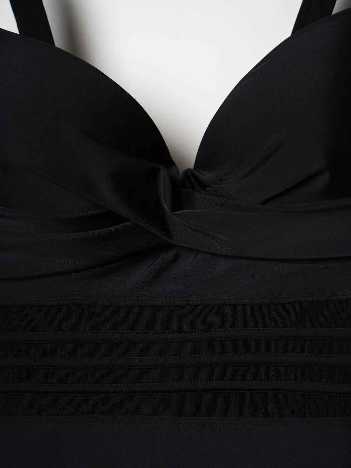 Женский черный слитный купальник. В области груди — мягкие чашки с косточками и декоративной драпировкой, обеспечивающие хорошую посадку. На талии — полупрозрачные вставки из сетки с полосами, визуально подчеркивающие фигуру. Спинка с аккуратной застежкой на металлическую пряжку и регулируемыми бретелями. Внутри - подкладка. Благодаря UF-защите, ткань сохраняет первоначальный вид даже при длительном пребывании на солнце. Подойдет для пляжа, отдыха и активного лета.