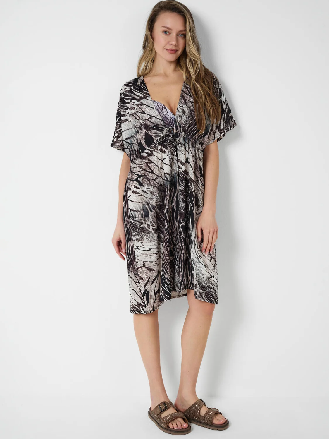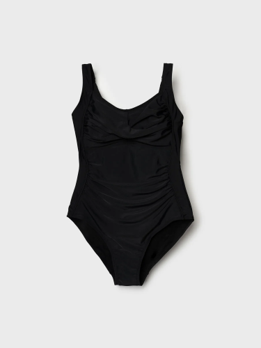 Женский раздельный купальник. Бюстгальтер с V-образным вырезом и эффектной перекрестной драпировкой, а также классические плавки средней посадки. Бюстгальтер имеет чашки, поддерживается косточками, регулируемыми лямками и застежкой сзади. На плавках сзади — маленький металлический значок. Внутри — мягкая подкладка. Все края аккуратно обработаны эластичными строчками, обеспечивающими комфортную посадку. Благодаря UF-защите, ткань сохраняет первоначальный вид даже при длительном пребывании на солнце. Подойдет для пляжа, отдыха и активного лета.