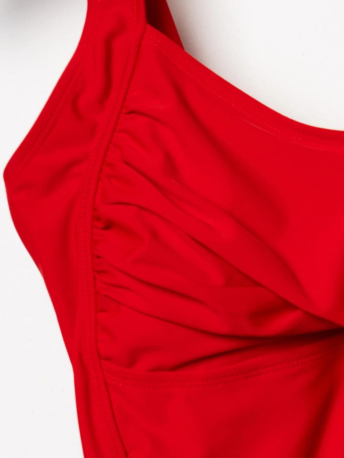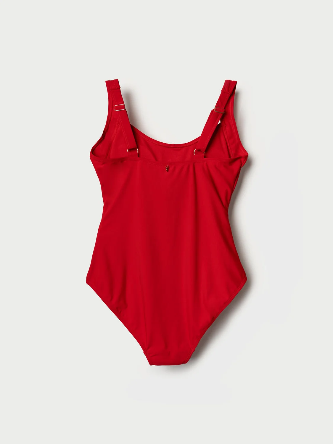 Женский слитный купальник. Перед оформлен мягкой драпировкой и перекрещивающимися складками, создающими визуальный эффект запаха. По бокам — сборки, которые визуально стройнят фигуру. Изделие выполнено из эластичной ткани, внутри есть подкладка. Бретели широкие, регулируются по длине с помощью металлической фурнитуры. На спинке — небольшой металлический значок. Внутри — чашечки для поддержки груди. Благодаря UF-защите, ткань сохраняет первоначальный вид даже при длительном пребывании на солнце. Подойдет для пляжа, отдыха и активного лета.