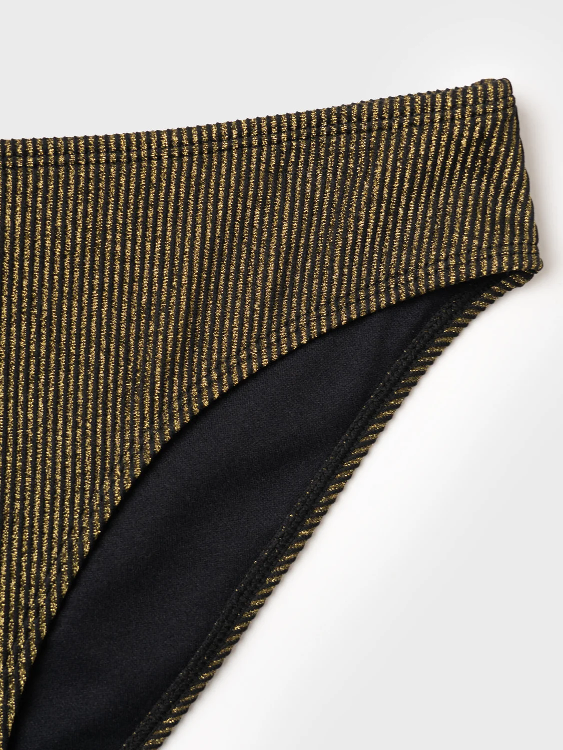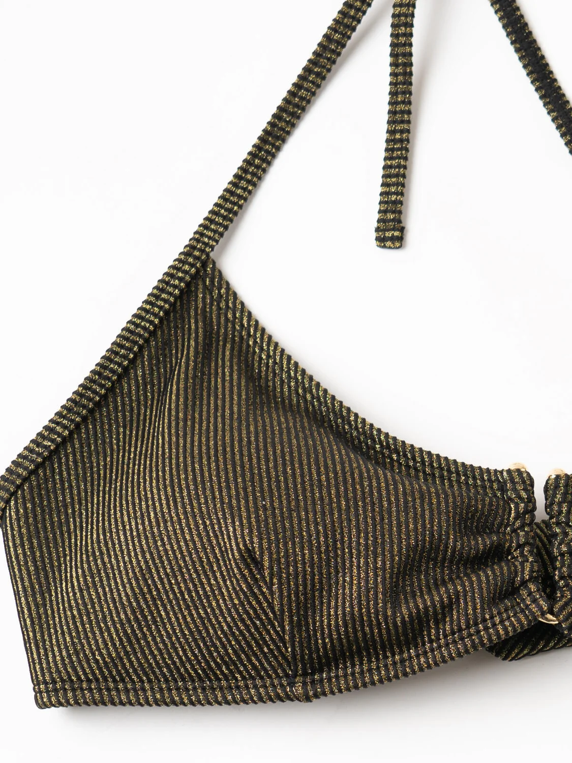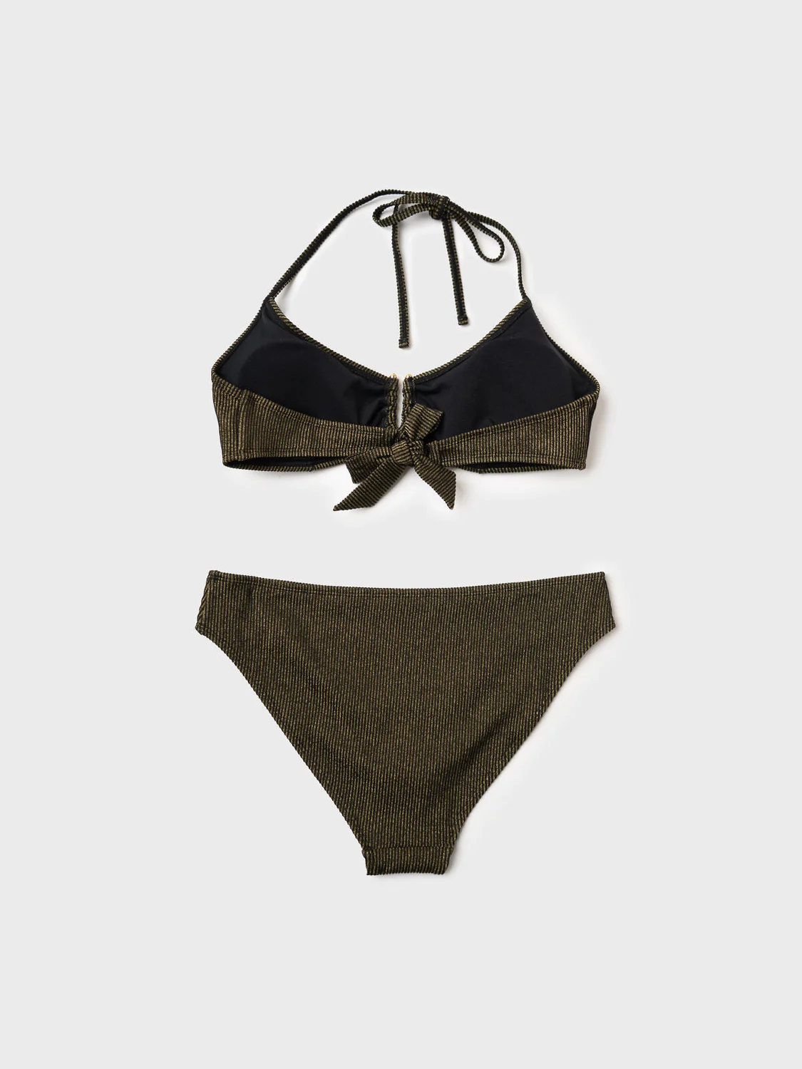 Раздельный женский купальник. Лиф с мягкими чашечками и завязками на шее, спереди украшен металлическим полукольцом, сзади — декоративным бантом. По бокам встроены мягкие косточки для поддержки. Плавки классической формы, украшены металлической фурнитурой на спинке. Внутри — мягкая подкладка для комфорта. Благодаря UF-защите, ткань сохраняет первоначальный вид даже при длительном пребывании на солнце. Подойдет для пляжа, отдыха и активного лета.