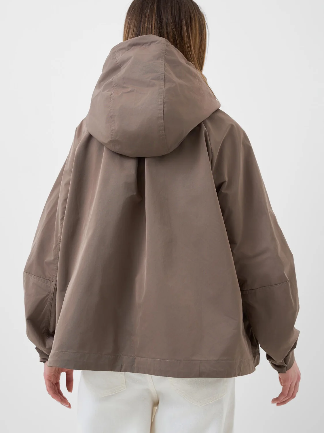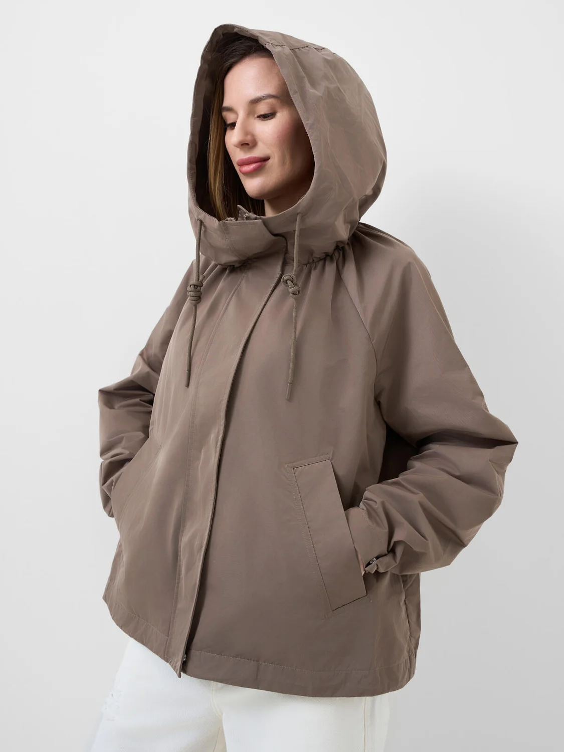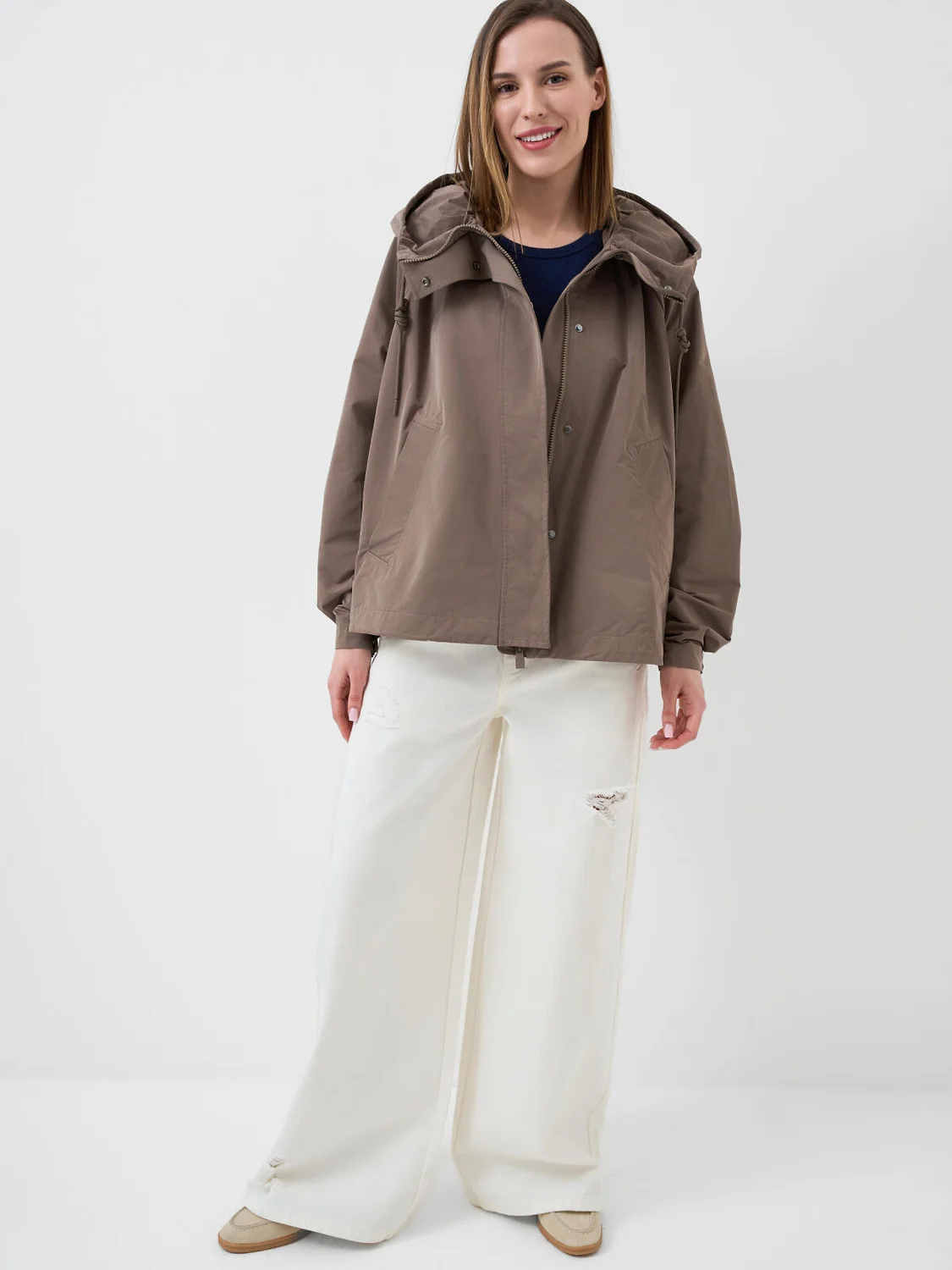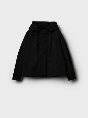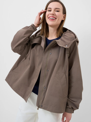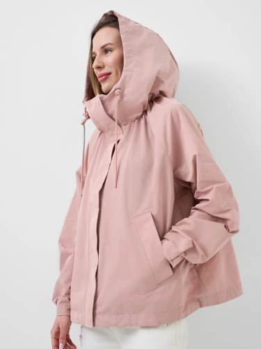 Женская ветровка оверсайз. Температурный режим от +20С до +10С. Ткань с ветрозащитным и водоотталкивающим покрытием. Застежка на молнию, закрытую ветрозащитной планкой на кнопках. Капюшон с регулировкой шнуром. Рукава с регулируемой шириной на манжете благодаря кнопкам. Два боковых кармана. Низ изделия регулируется стопперами.