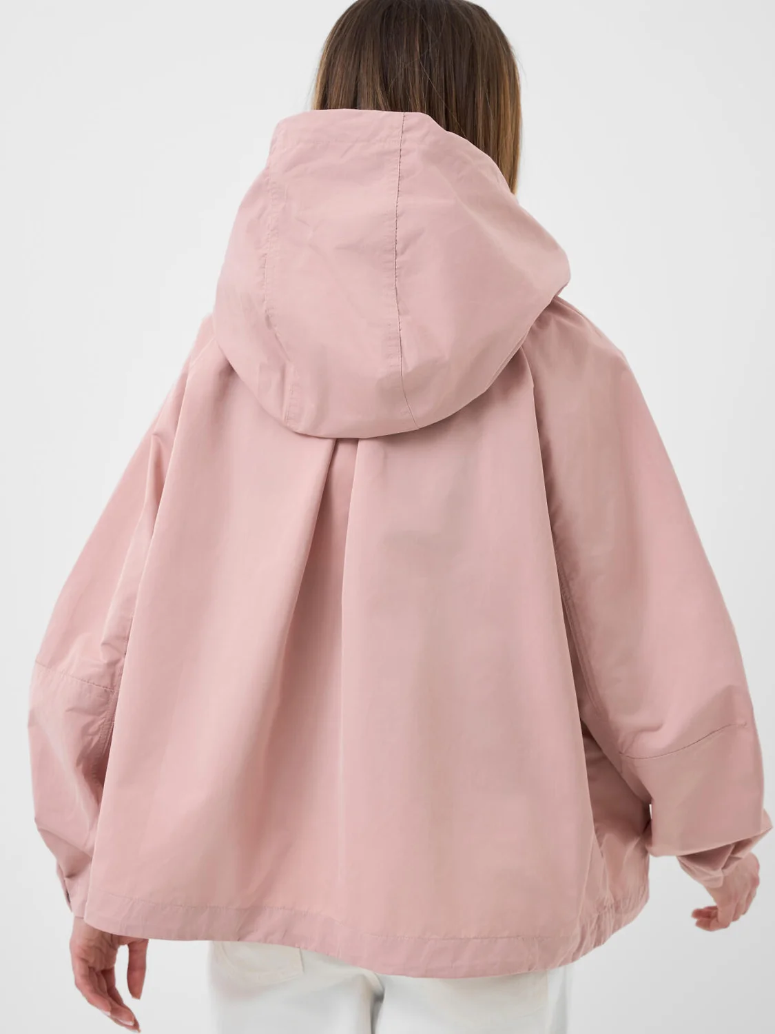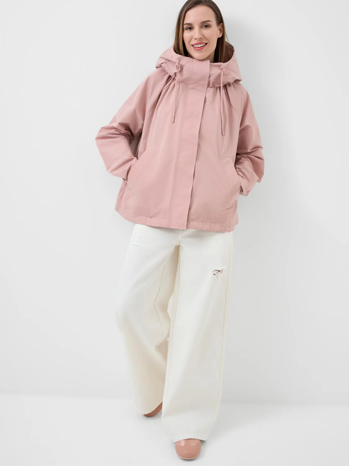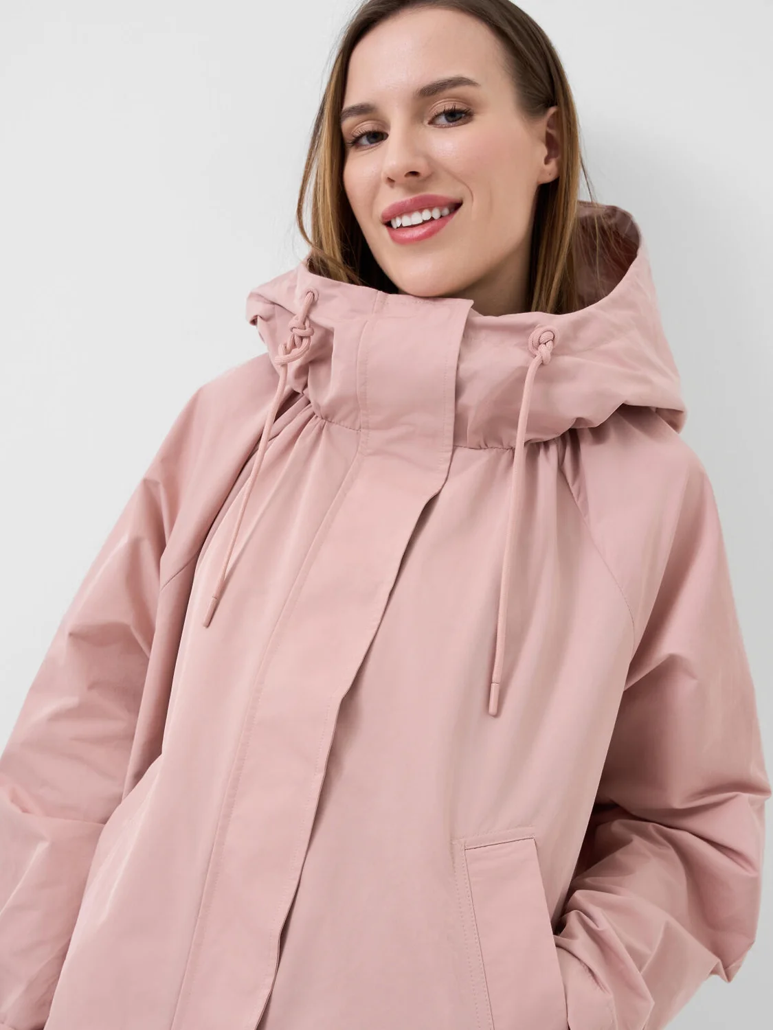 Женская ветровка оверсайз. Температурный режим от +20С до +10С. Ткань с ветрозащитным и водоотталкивающим покрытием. Застежка на молнию, закрытую ветрозащитной планкой на кнопках. Капюшон с регулировкой шнуром. Рукава с регулируемой шириной на манжете благодаря кнопкам. Два боковых кармана. Низ изделия регулируется стопперами.