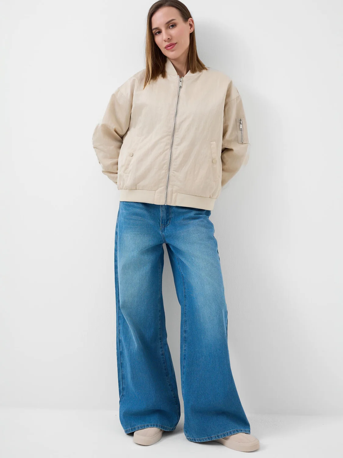 Женский бомбер оверсайз. Температурный режим от +15С до 0С. Ткань с ветрозащитным и водоотталкивающим покрытием. Внутри гладкая стеганная подкладка. У изделия классический короткий трикотажный воротник. трикотажная резинка по низу и на манжетах. Удобные боковые карманы на кнопках и один декоративный карман на рукаве с молнией и логотипом.