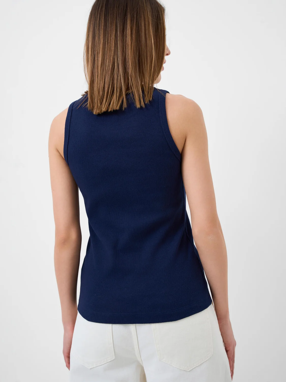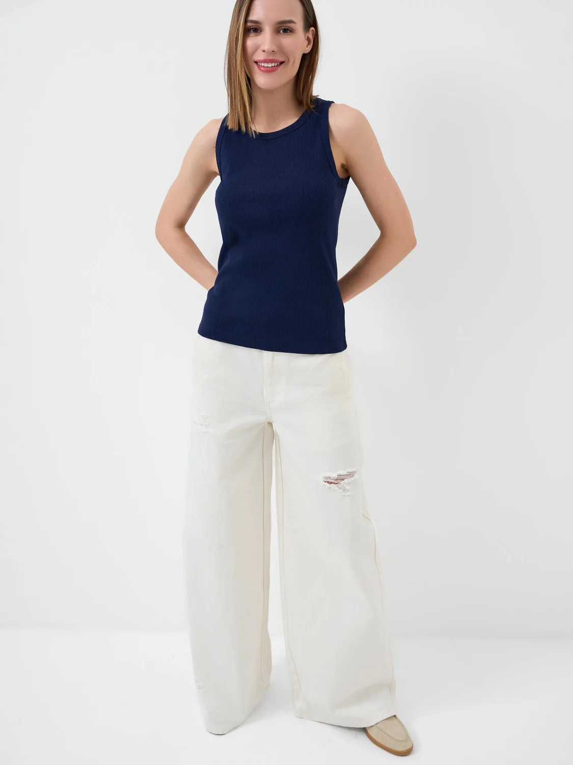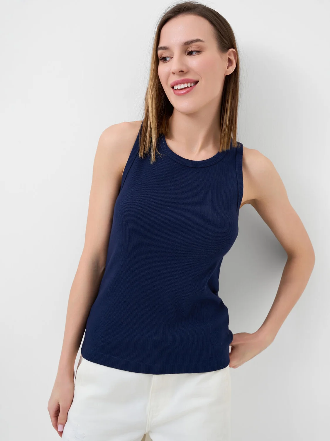 Женская базовая майка. Модель прямого силуэта, без рукавов, с круглой горловиной. Выполнена из хлопкового трикотажа в рубчик.