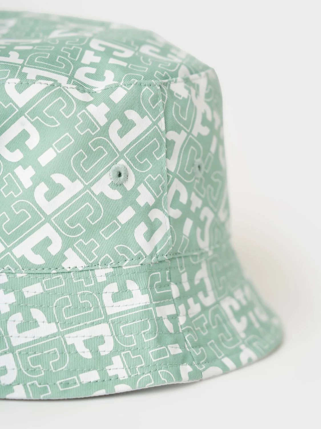 Женская панама. Модель двусторонняя: одна сторона выполнена в белом цвете с мятным логотипом на нашивке, другая — с полным мятно-белым принтом. Панама имеет круговые поля средней ширины с декоративной строчкой.
