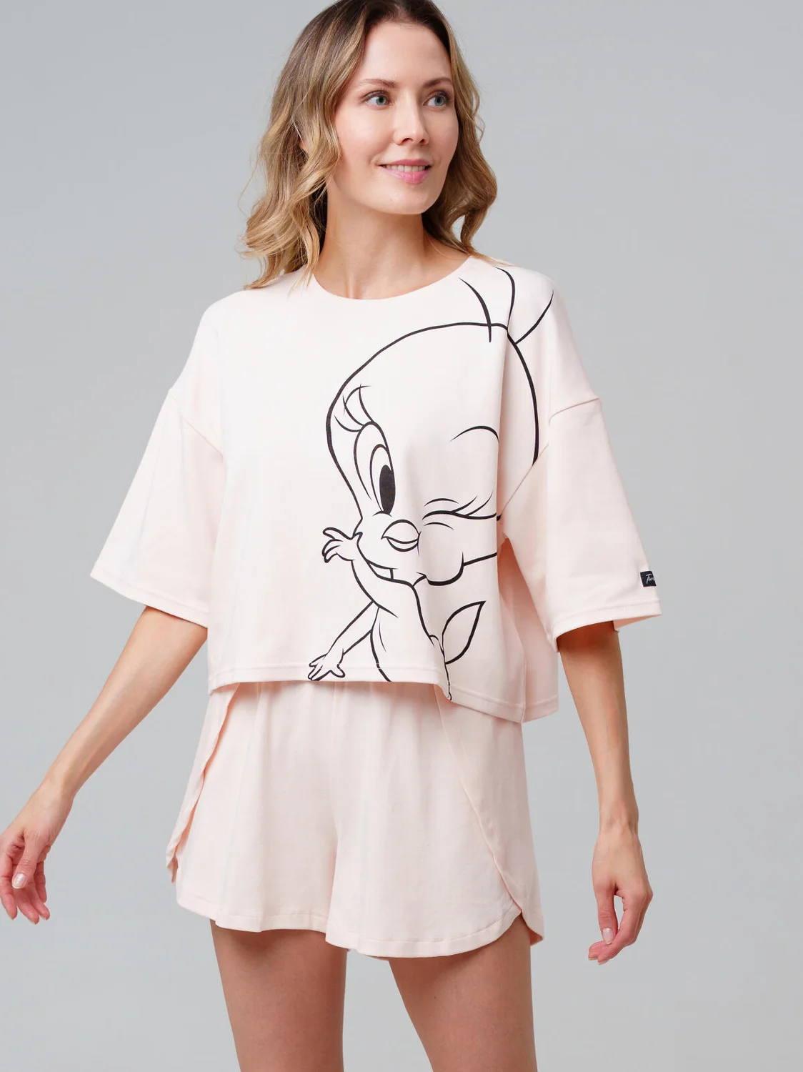 Пижама женская с шортами Луни Тюнз от PlayToday — уютный комплект для сна и отдыха. Модель выполнена из мягкого хлопкового трикотажа с добавлением эластана, чтобы обеспечить комфортную посадку и свободу движений. Принт с милым Твити на футболке придаёт образу игривости и поднимает настроение.