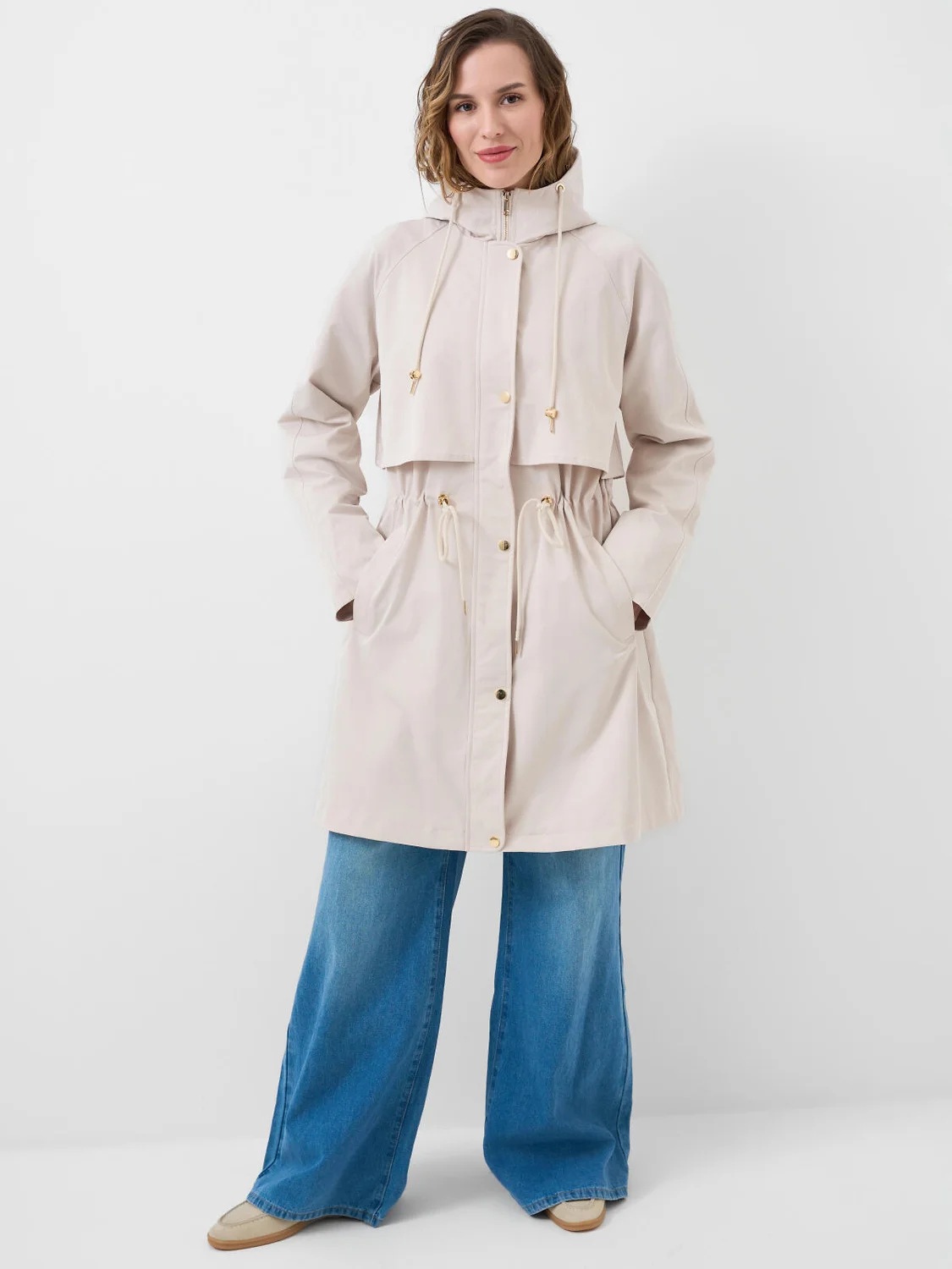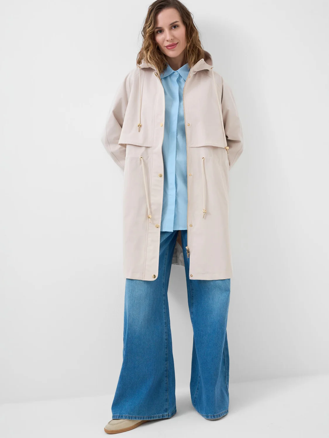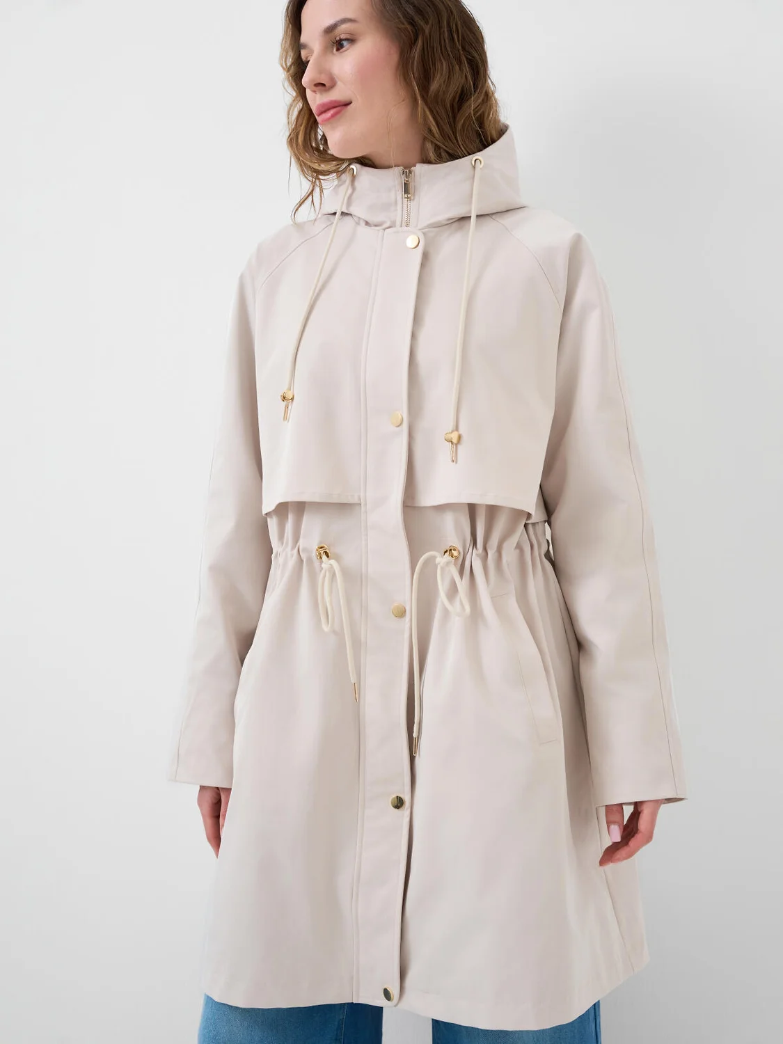 Женский плащ средней длины, выполненный в современном стиле с удобным капюшоном и приталенным силуэтом благодаря утяжке на талии. Температурный режим от +20°C до +10°C. Ткань с ветрозащитным и водоотталкивающим покрытием. Внутри гладкая подкладка. Капюшон с утяжкой шнуром. Два вместительных кармана. Утяжка на талии и удобная застежка — молния с ветрозащитной защитной планкой на кнопках. Внутри рукавов — мягкие эластичные манжеты для дополнительного комфорта и защиты от ветра.
