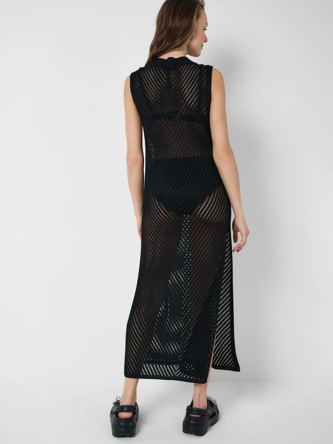 Женская пляжная туника из легкого ажурного трикотажа. Модель без рукавов, с круглой горловиной и свободным прямым кроем, длиной до щиколотки. По бокам предусмотрены разрезы, что добавляет изделию лёгкости и подвижности. Горловина, проймы и низ изделия обработаны контрастной вязаной отделкой. Идеально подходит для пляжа или летнего отдыха.