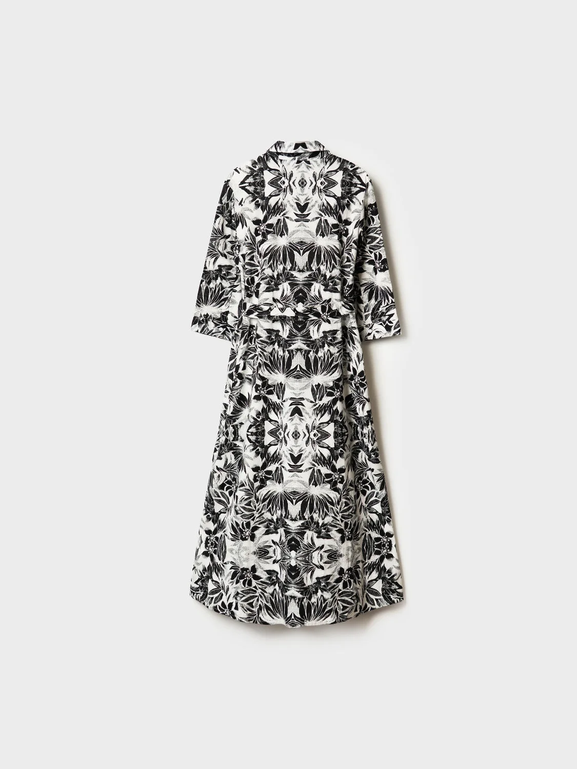Женское платье в длине макси. Модель выполнена из хлопковой ткани, имеет прямой верх и расширенную к низу юбку, за счёт чего красиво смотрится в движении. Платье застёгивается на пуговицы. Линия талии подчёркивается съёмным поясом. Рукава длинные, с манжетами на пуговицах. По бокам предусмотрены удобные карманы. Воротник классический, отложной.