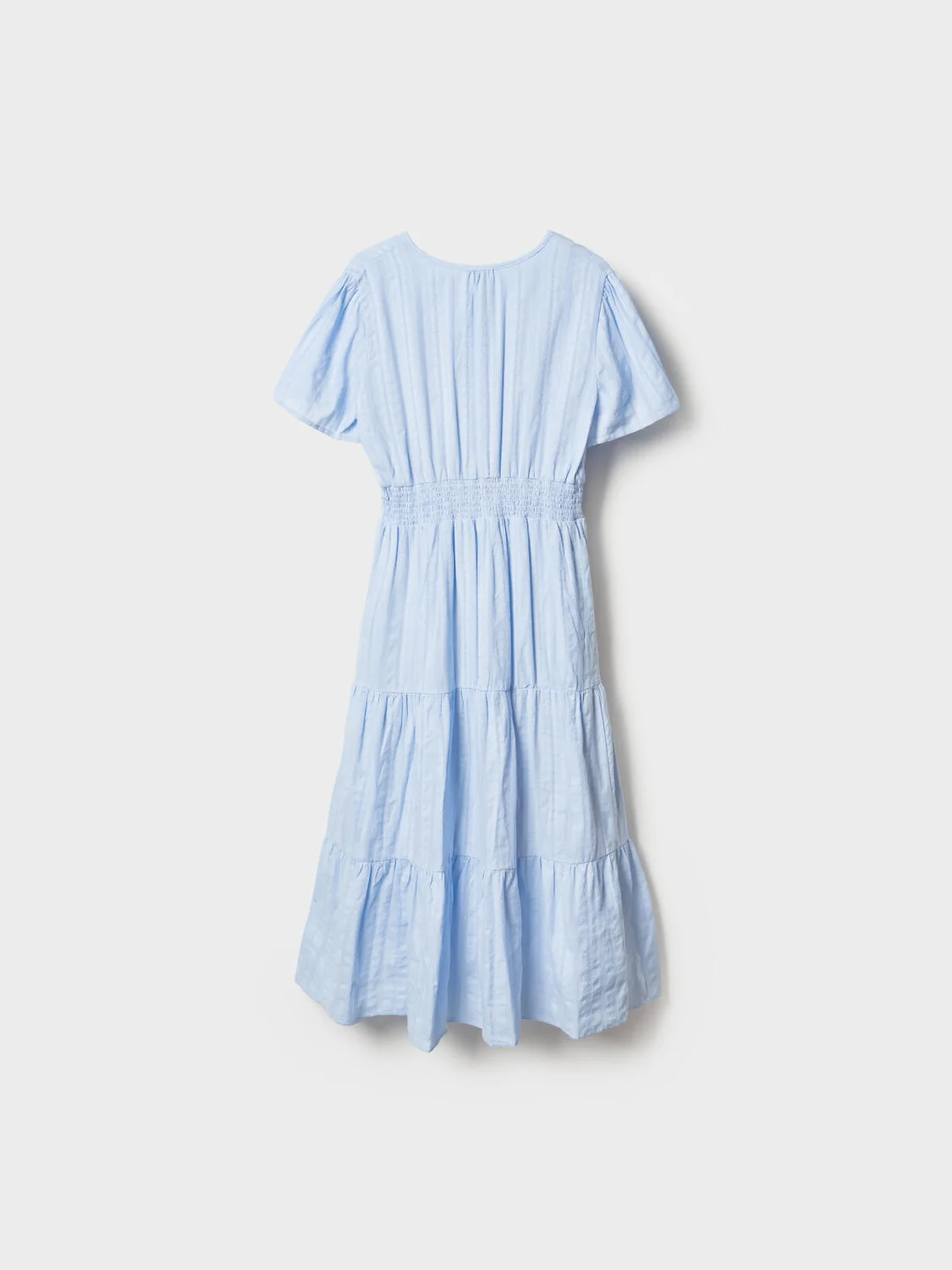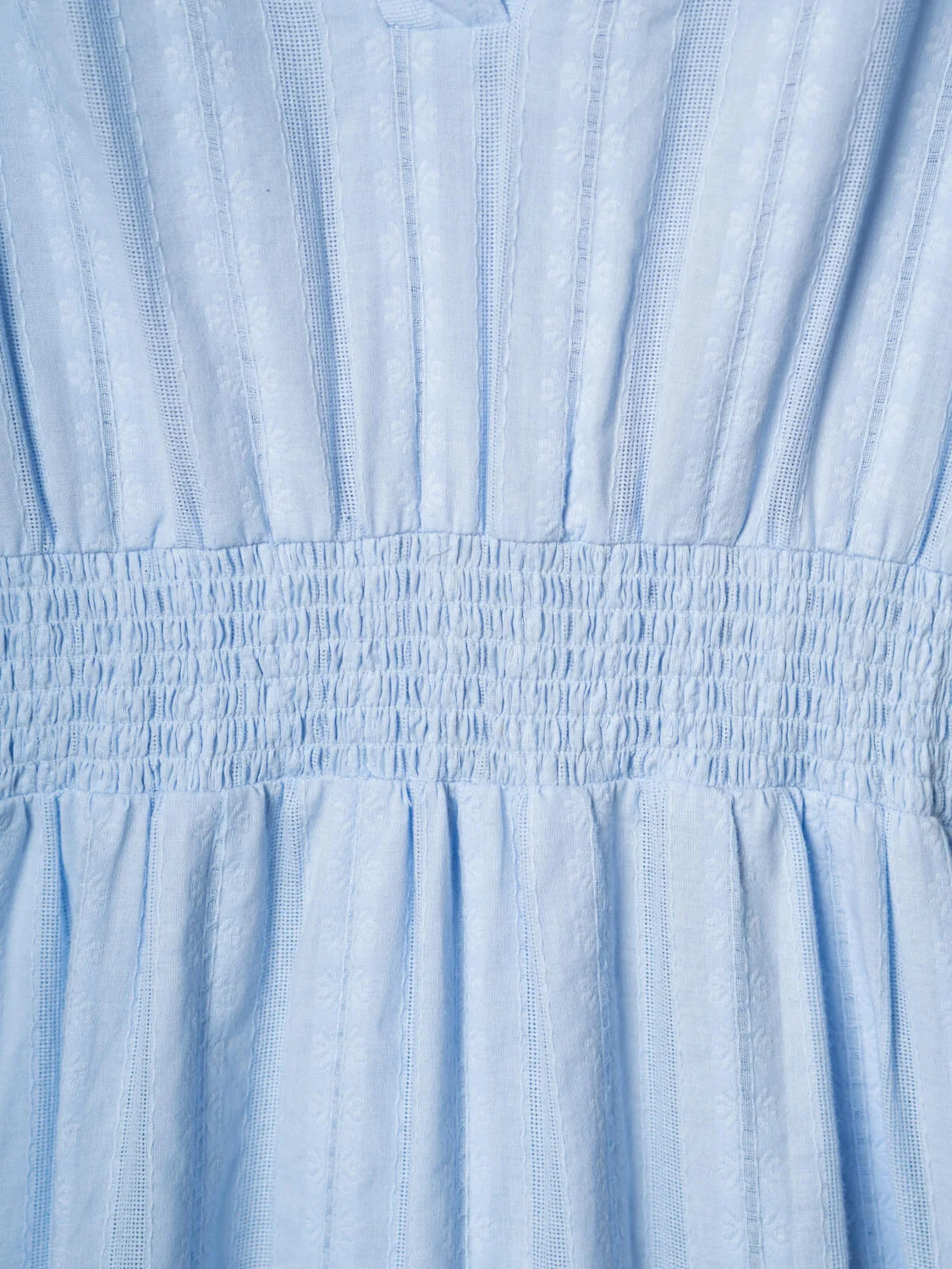 Женское летнее платье в длине миди. Модель имеет широкую резинку по талии. Верхняя часть дополнена подкладкой для комфорта. Хлопковая ткань с тонким фактурным рисунком и цветочными элементами придаёт изделию нежный и воздушный вид. V-образный вырез делает образ более выразительным.