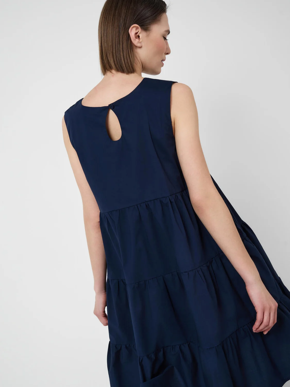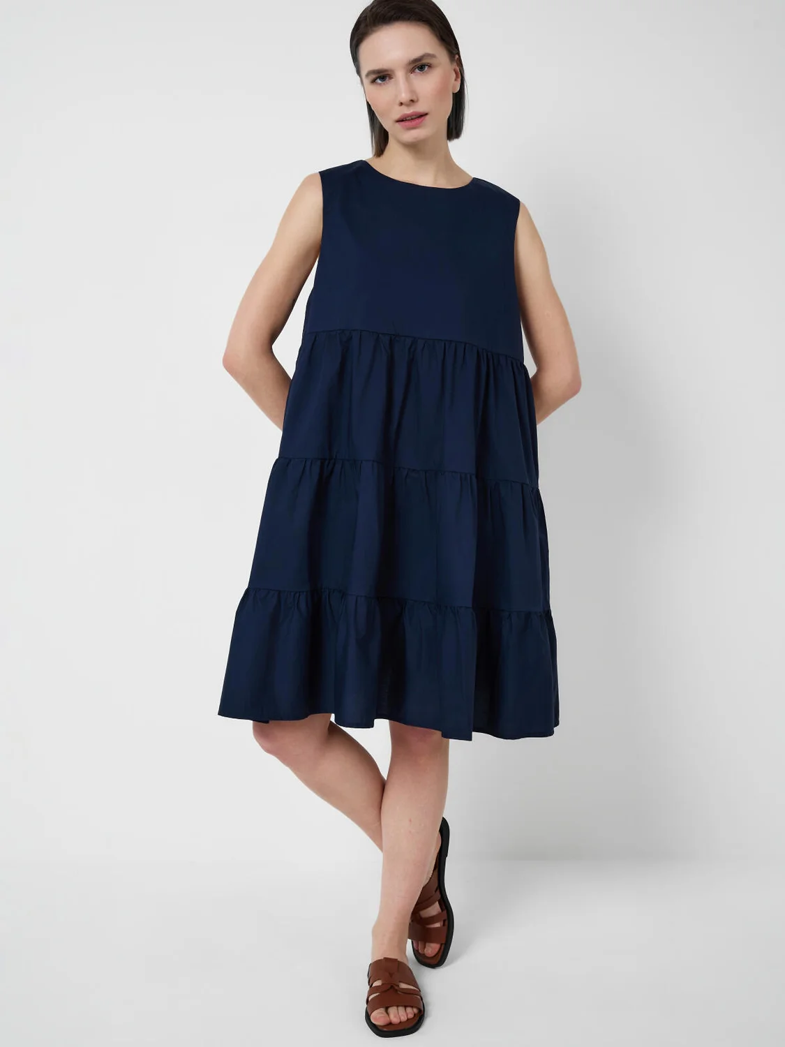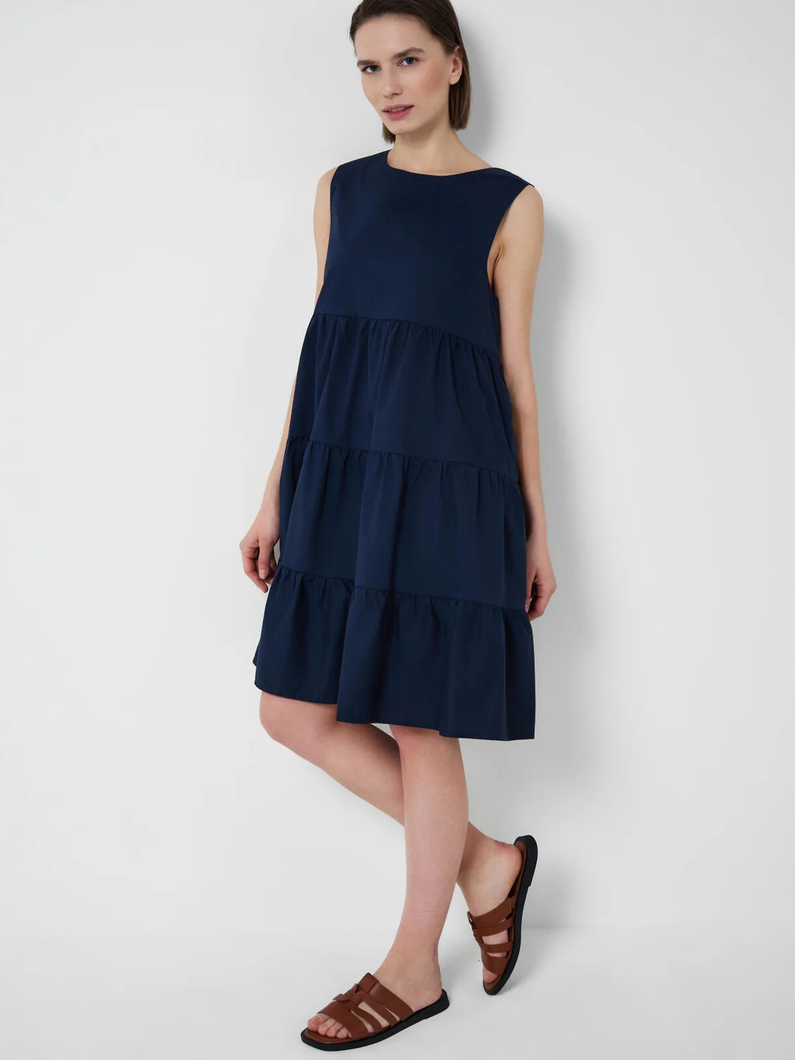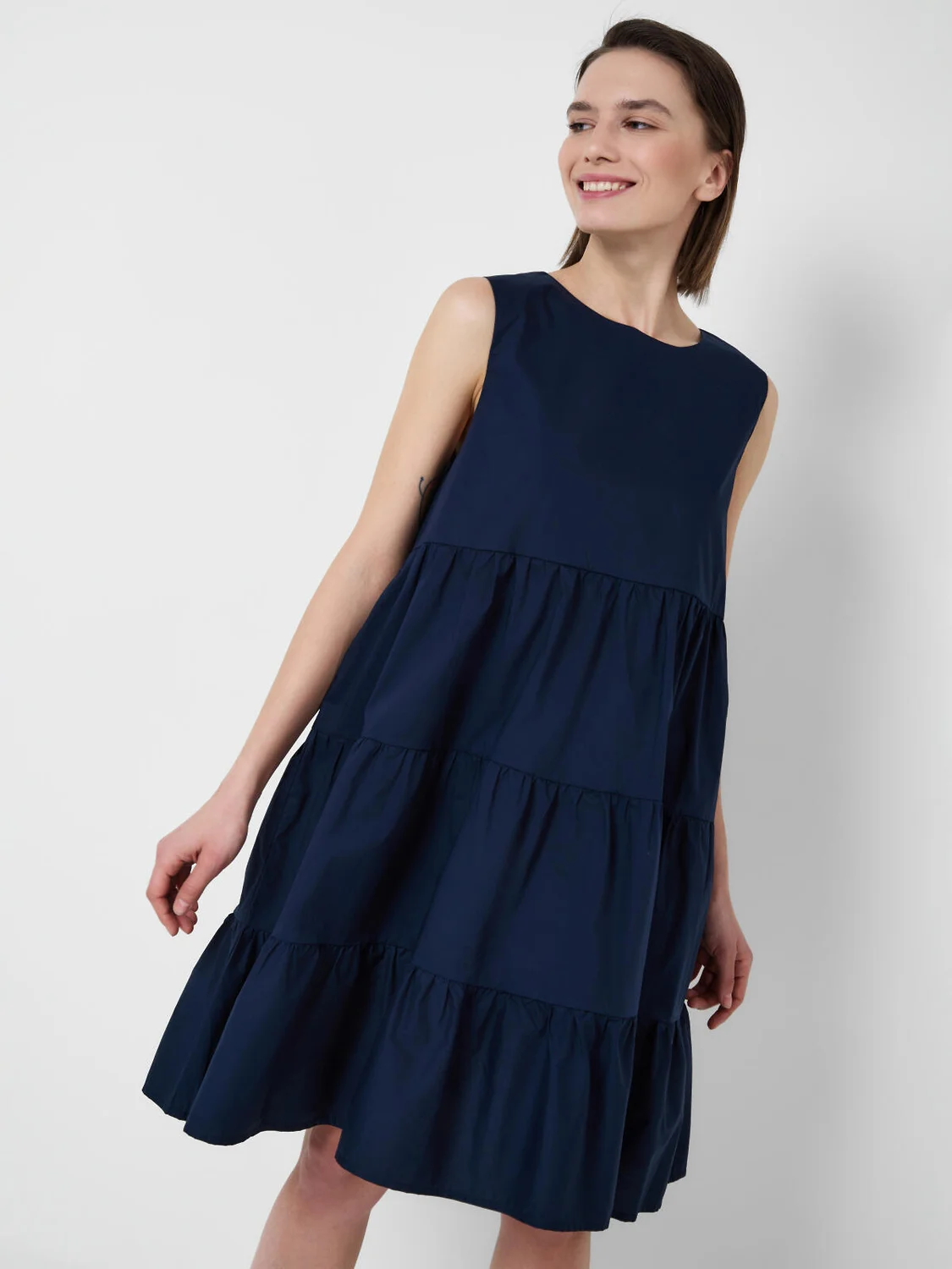 Женское платье свободного силуэта. Выполнено из лёгкой хлопковой ткани поплин. Модель в длине миди, состоит из присборенных блоков, за счёт чего юбка выглядит объёмной и летящей. Спереди — классический лаконичный вид, сзади — небольшая застёжка на пуговицу.