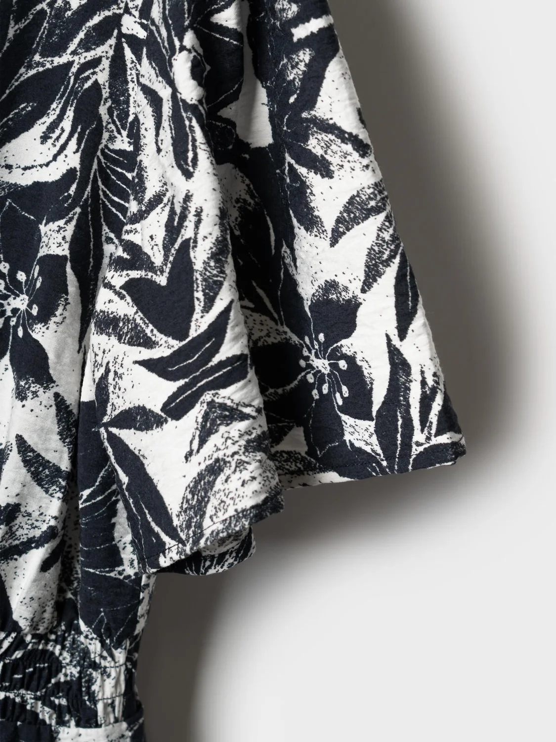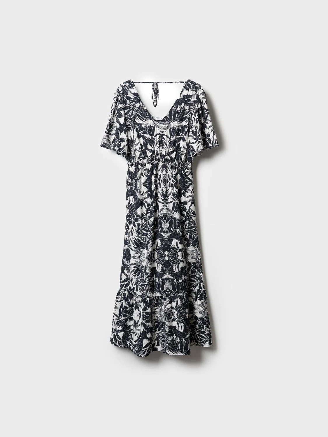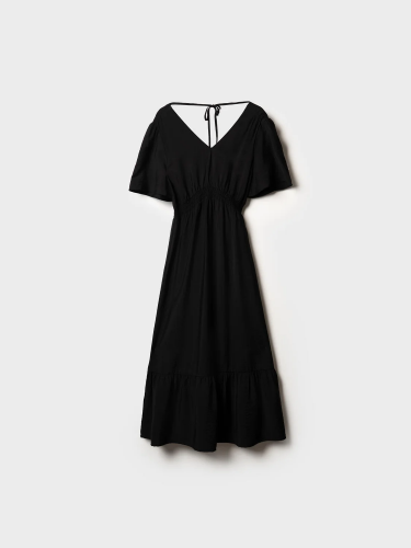 Женское летнее платье миди. Материал — лёгкая вискозная ткань с ярким цветочным принтом. V-образный вырез спереди и сзади, на спинке предусмотрена декоративная завязка. В талии вшита внутренняя резинка, что обеспечивает комфортную посадку. По низу изделия расположен широкий волан, придающий образу лёгкость и женственность.