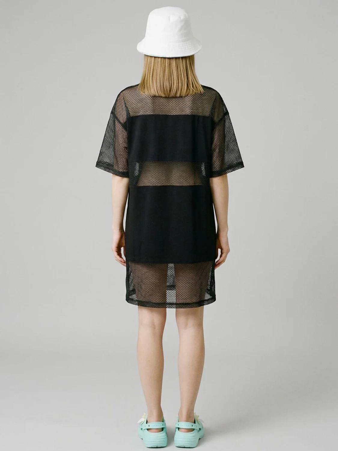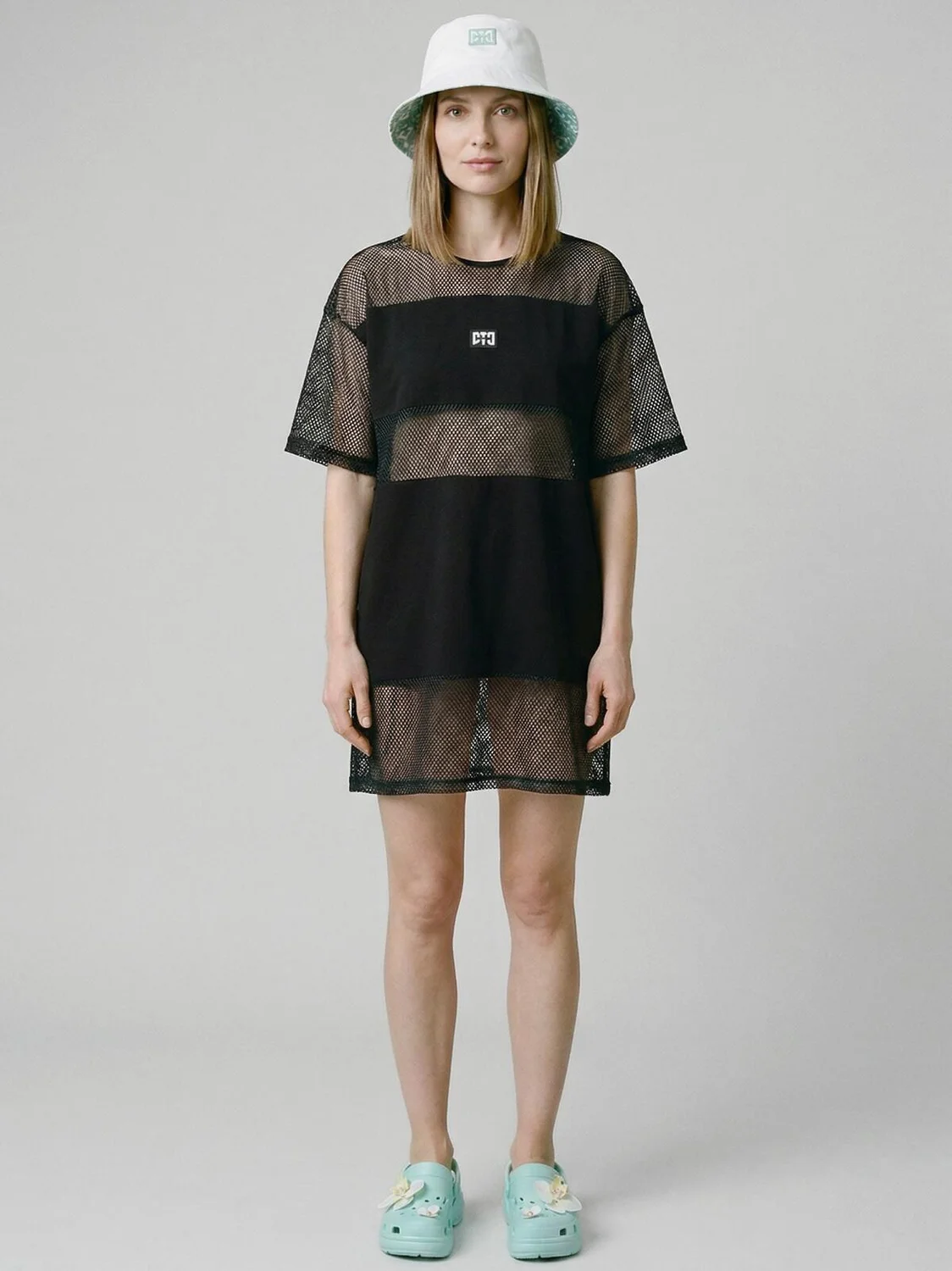 Пляжное женское оверсайз платье. Модель с длиной мини, выполнена из комбинации хлопкового трикотажа джерси и сетки. На груди размещён небольшой логотип в виде жаккардовой нашивки. Можно составить family look c детским вариантом аналогичного дизайна.