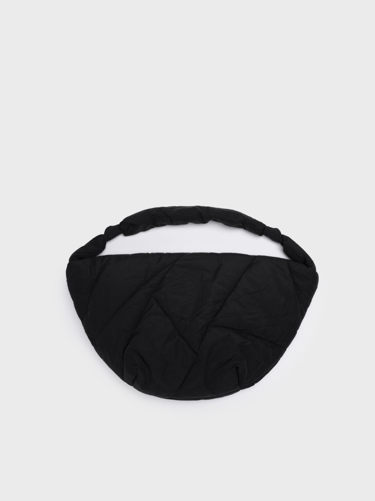 Трендовая женская дутая сумка с оригинальной простежкой. Форма полумесяц. Яркая подкладка является акцентной деталью этой модели. Сумку можно носить как на плече, так и как кросс-боди. Сумка закрывается на молнию. Внутри есть карман на молнии для документов. Параметры: высота - 28 см, ширина - 56 см, глубина - 15 см.