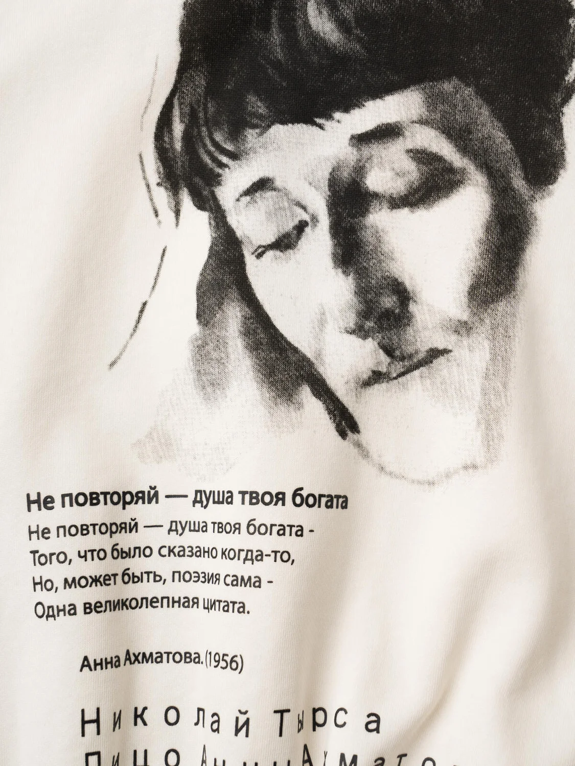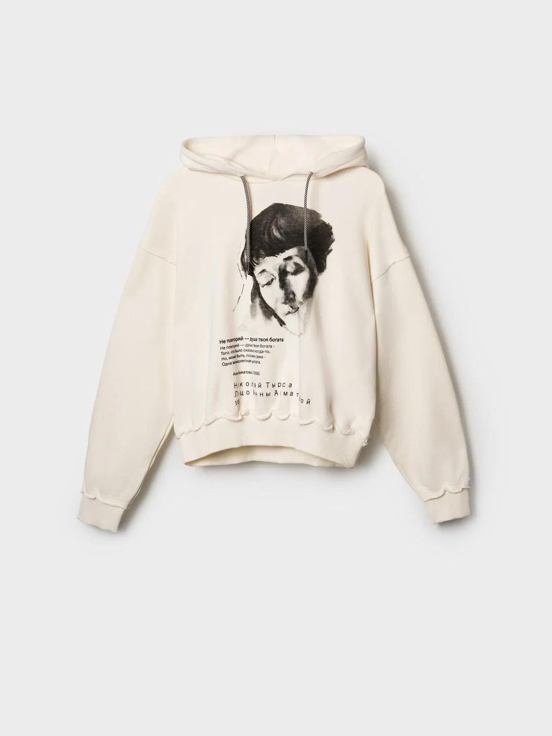 Женское худи оверсайз. Выполнена из хлопкового футера без начеса. Капюшон регулируется шнуром. На груди — портрет Анны Ахматовой, выполненный художником Николаем Тырсой в 1928 году. Низ изделия и рукава оформлены эластичными резинками. Модель укороченная, длиной до бедер.