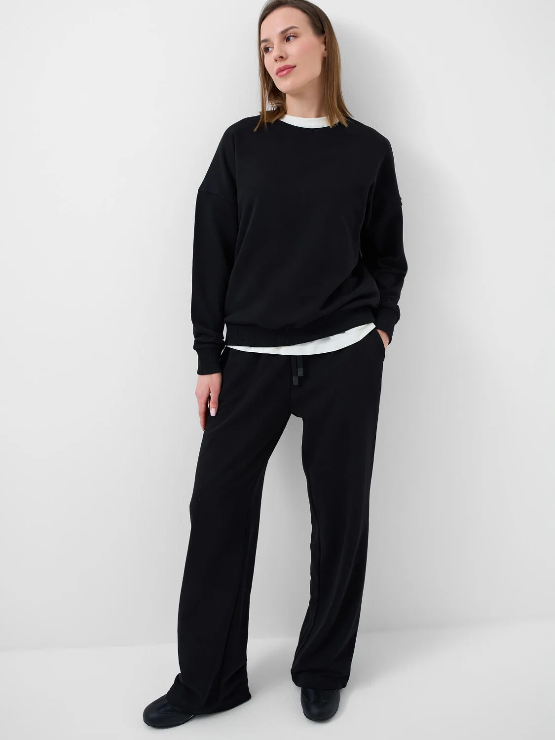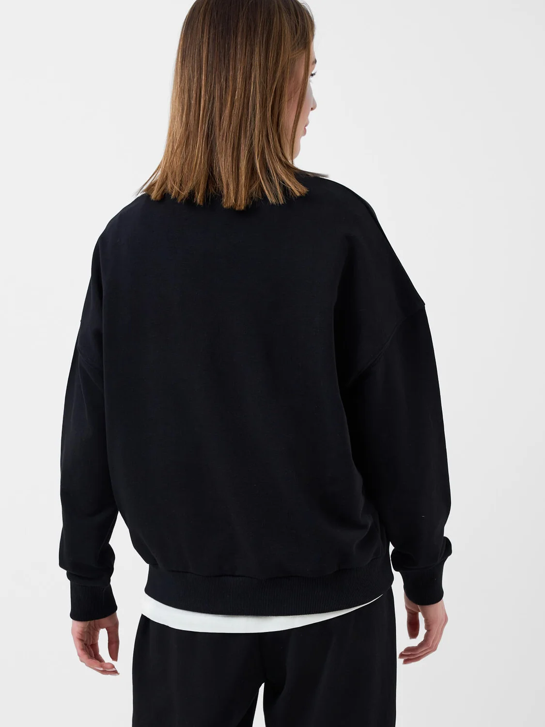 Женский черный свитшот оверсайз. Выполнен из хлопкового футера без начеса. Горловина, манжеты и низ изделия выполнены из эластичного риба, что обеспечивает комфортную посадку.