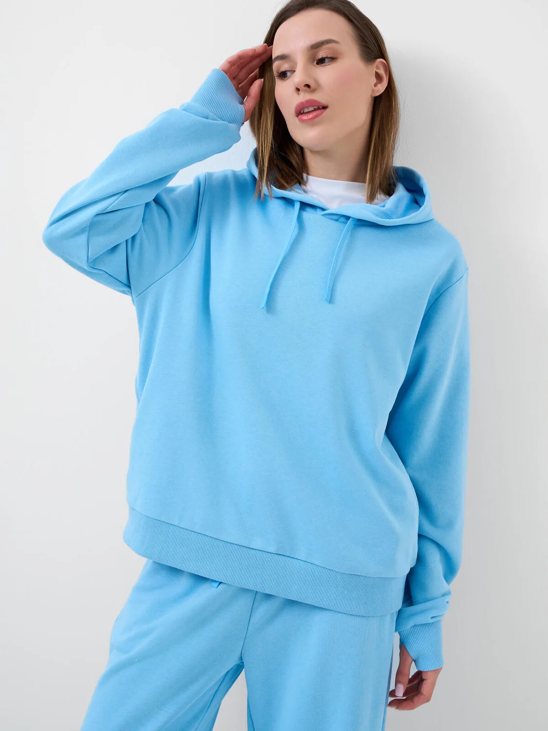 Женское худи оверсайз. Выполнена из хлопкового футера без начеса. Капюшон регулируется шнуром. Два боковых кармана. Низ изделия и рукава оформлены эластичными резинками.