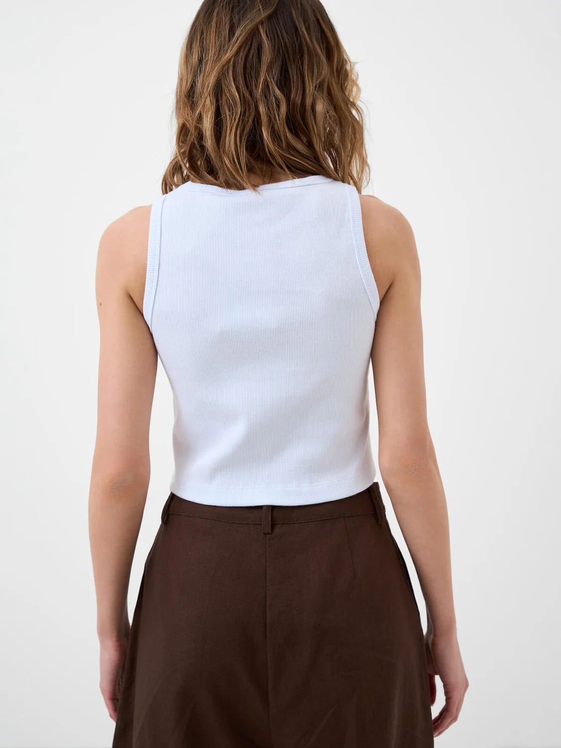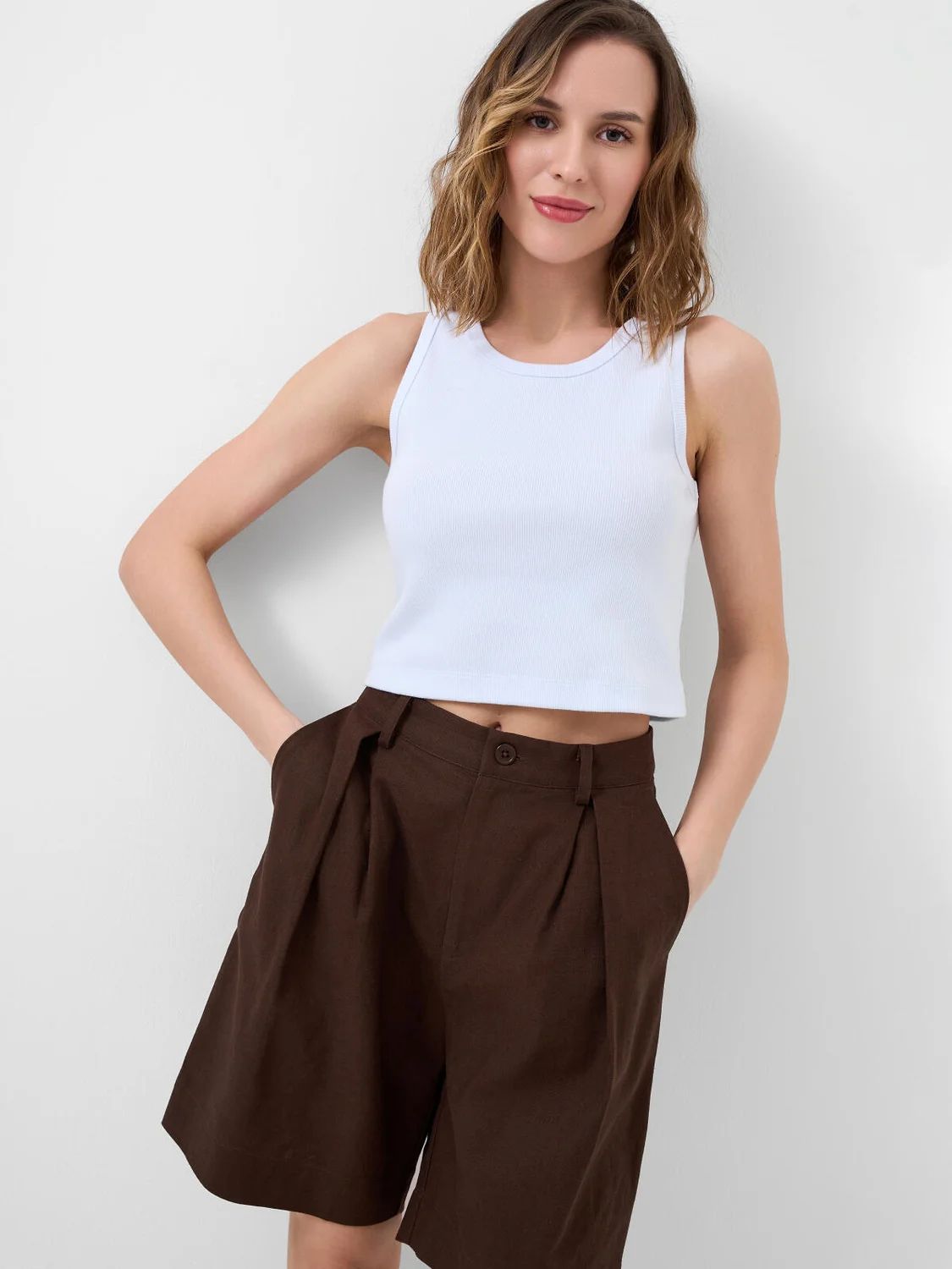 Белый женский топ. Базовая модель из приятного мягкого, хлопкового трикотажа в рубчик. Топ укороченный, прямого кроя с круглой горловиной. Проймы и горловина обработаны в тон основной ткани. Низ аккуратно подшит.