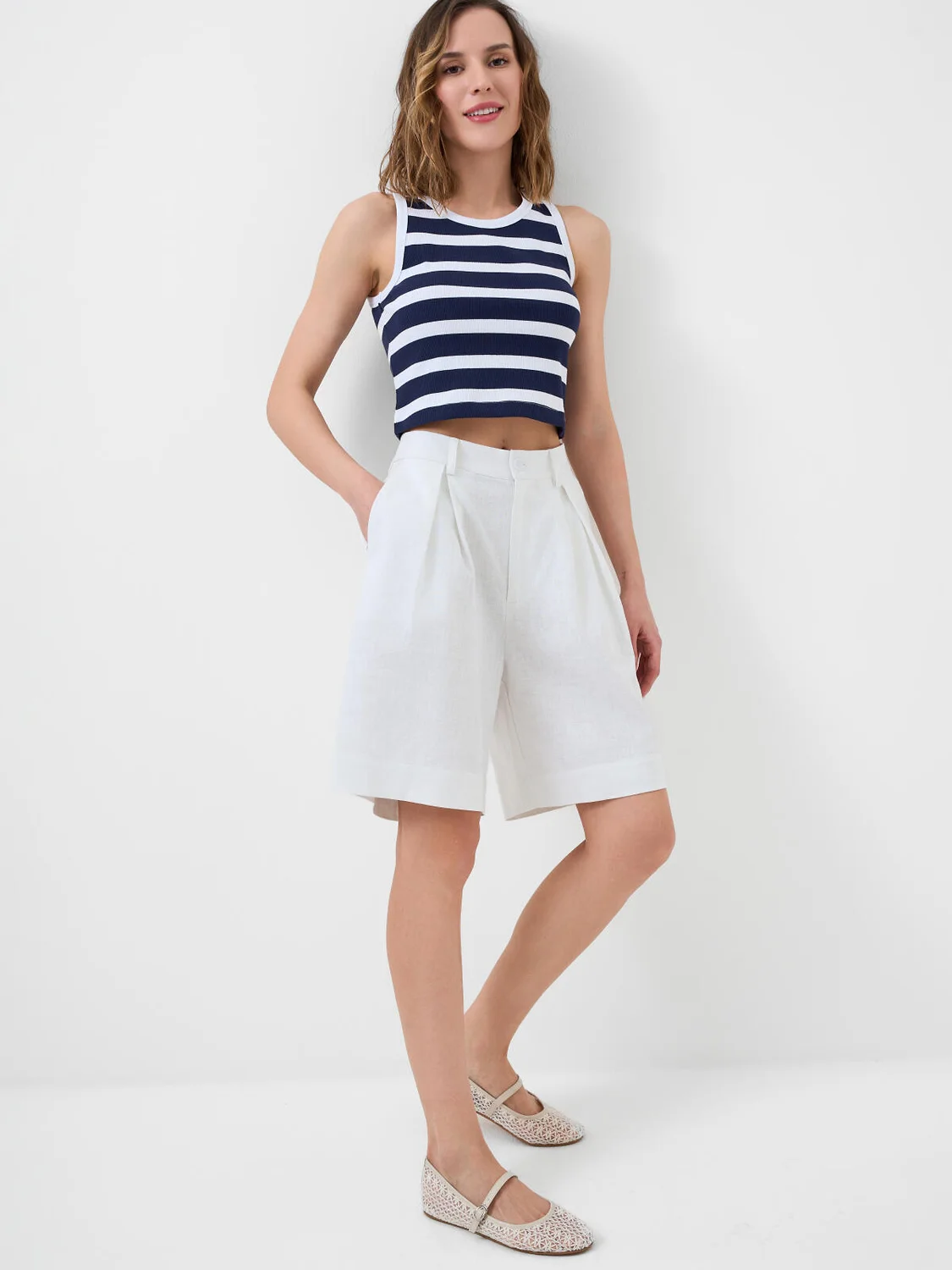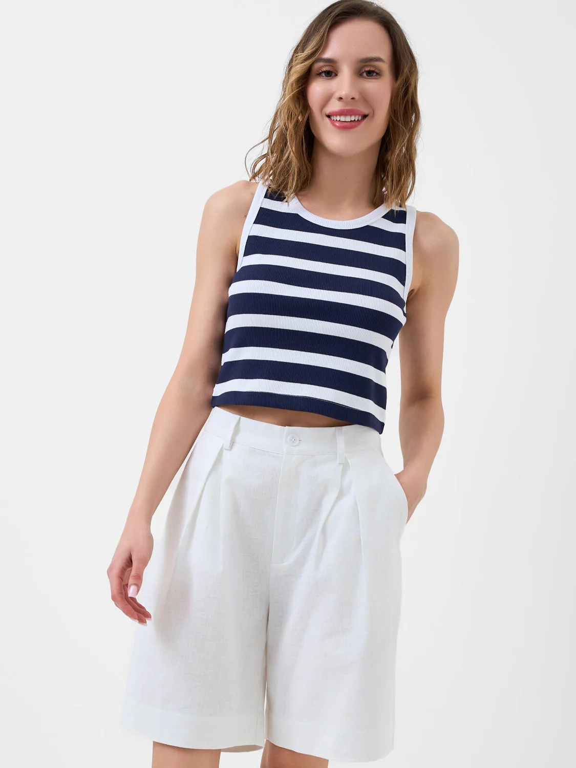 Женский топ в полоску. Базовая модель из приятного мягкого, хлопкового трикотажа в рубчик. Топ укороченный, прямого кроя с круглой горловиной. Проймы и горловина обработаны в тон основной ткани. Низ аккуратно подшит.
