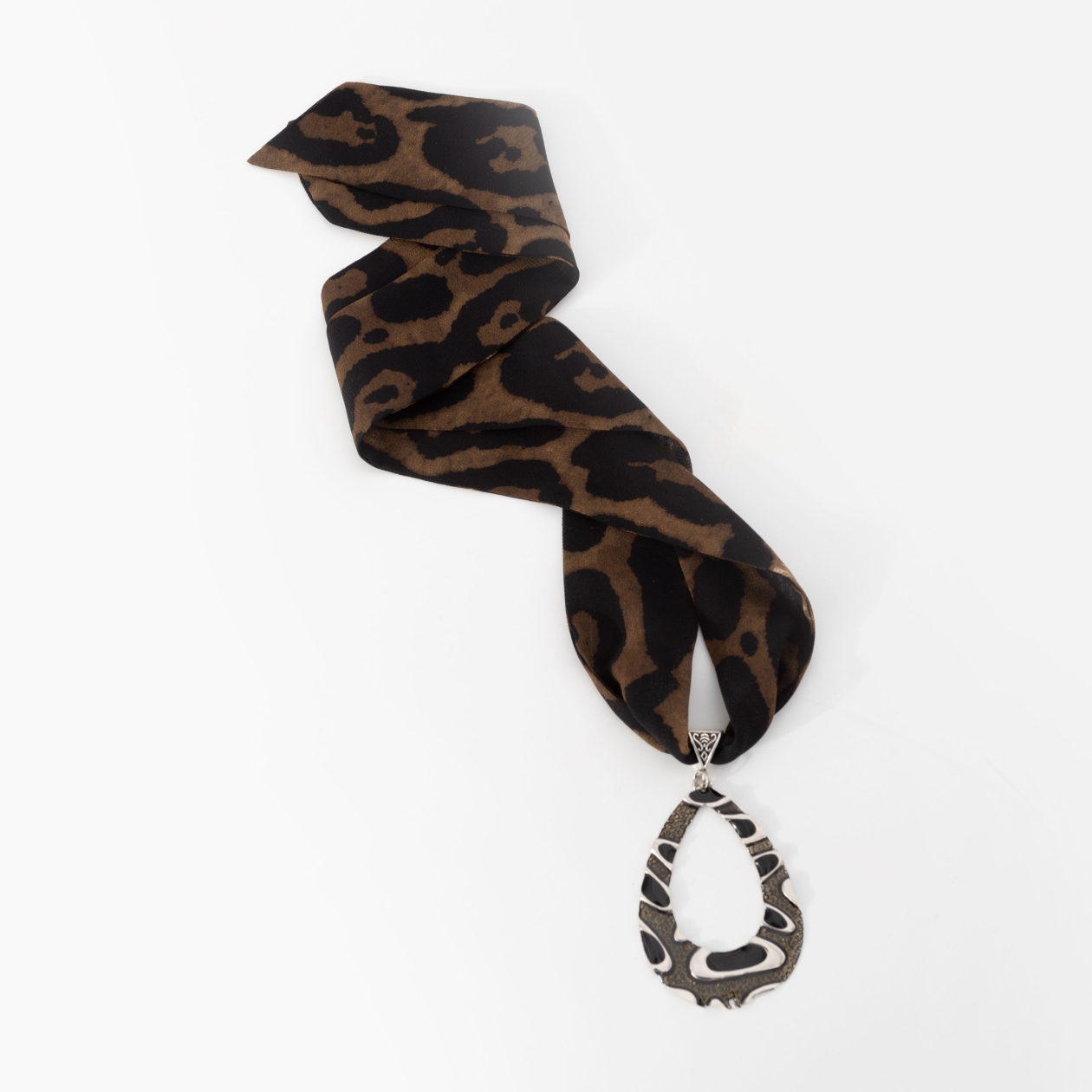 Необузданный стиль – это когда инстинкты работают точнее трендов. Леопардовая лента звучит дико, но благородно, как природный камуфляж с характером. Крупный подвес притягивает взгляд сразу – и дальше уже не отпускает. В этом аксессуаре нет случайностей: только врождённый вкус и лёгкая дерзость.