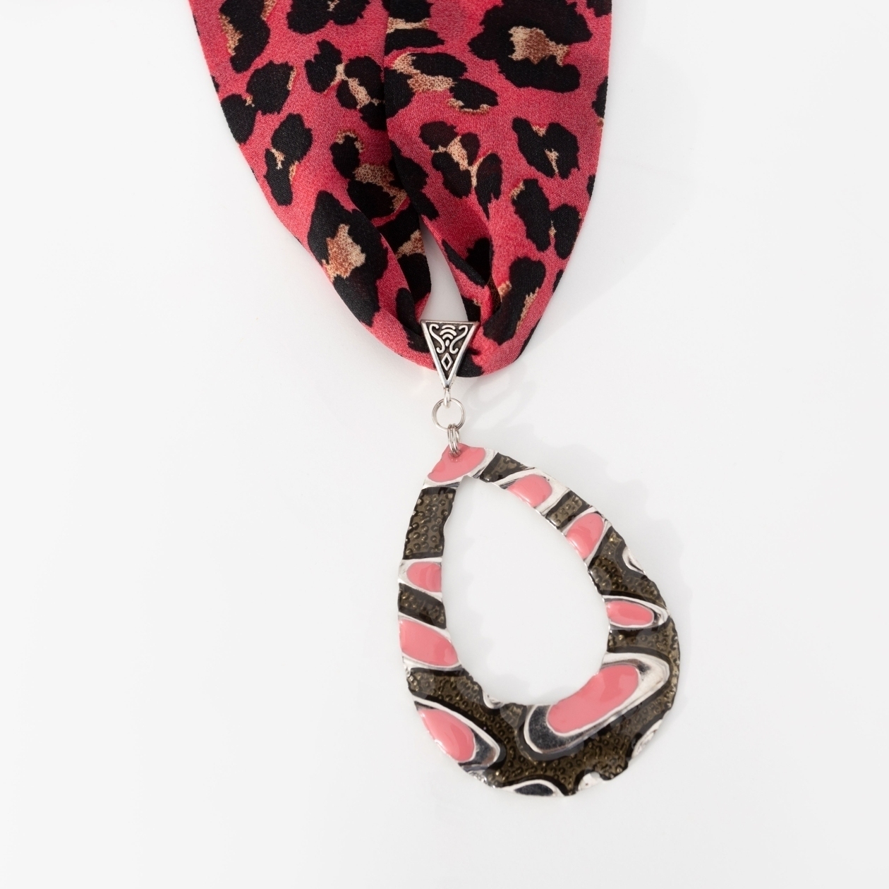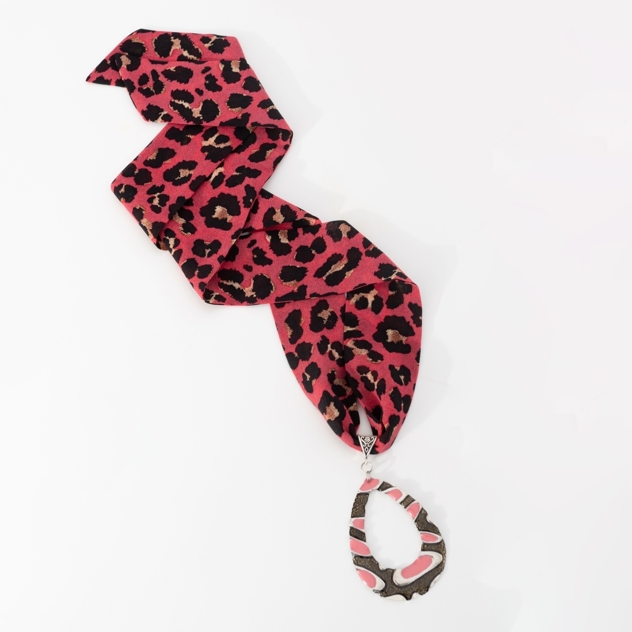 Оригинальность – это когда даже леопард играет по твоим правилам. Этот подвес не пытается быть удобным – он хочет быть заметным. И да, с ним сложно остаться в тени. Лента мягко драпируется, позволяя менять длину и настроение: завязать ближе к шее для дерзкого акцента или опустить ниже – в формате богемного жеста. Крупный кулон притягивает взгляд и собирает образ вокруг себя. Характер – в деталях!