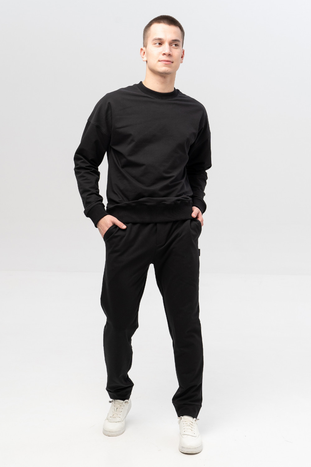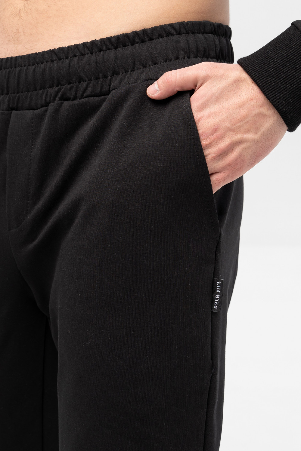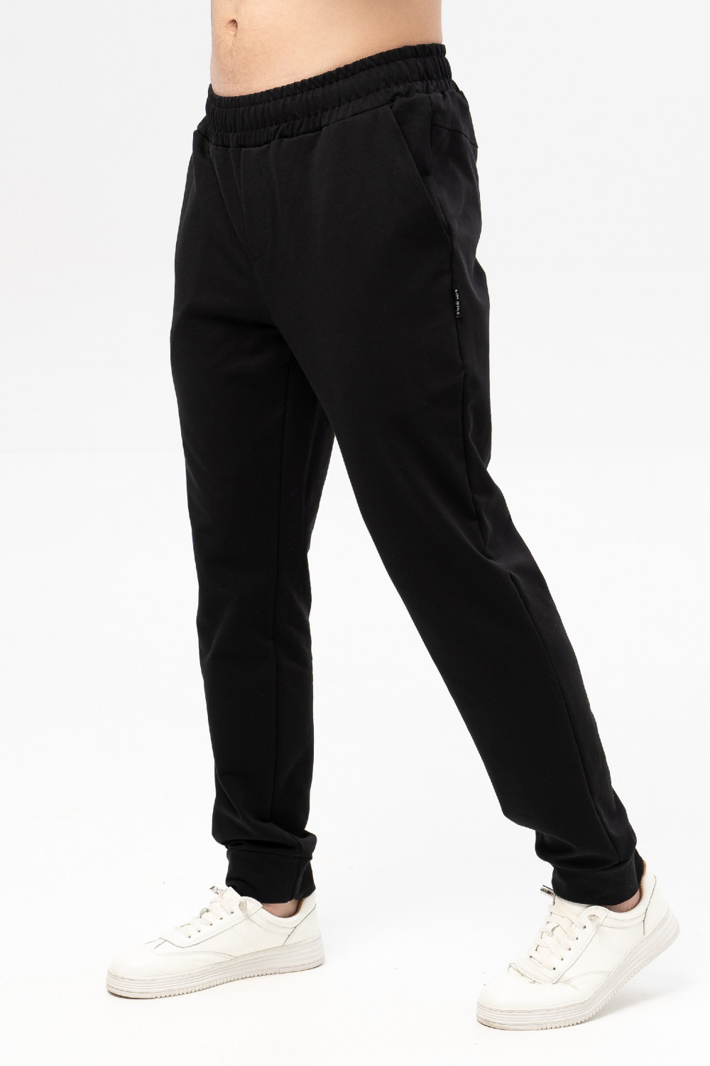 Мужские брюки выполнены из хлопкового футера. Брюки с высокой посадкой, с карманами и манжетами из основного полотна по низу брюк. Модель универсальна и сочетается, как с толстовками, свитшотами, так и с футболками.