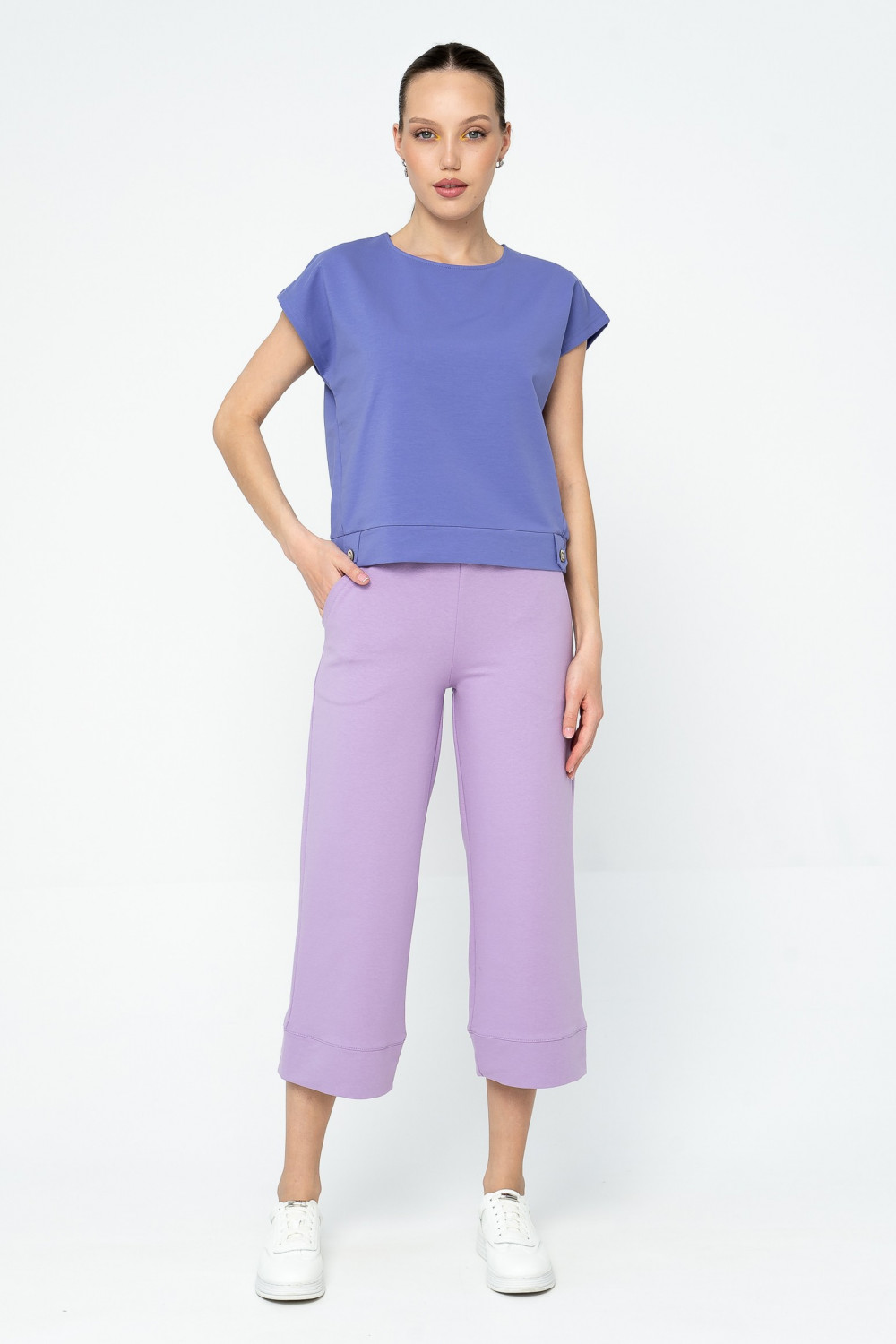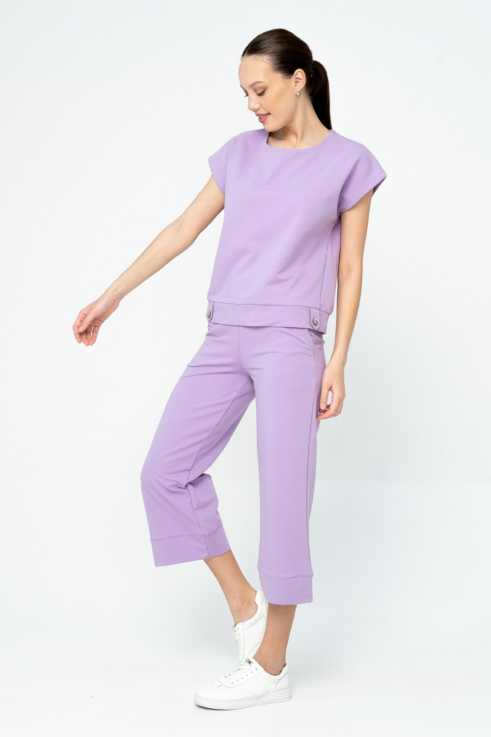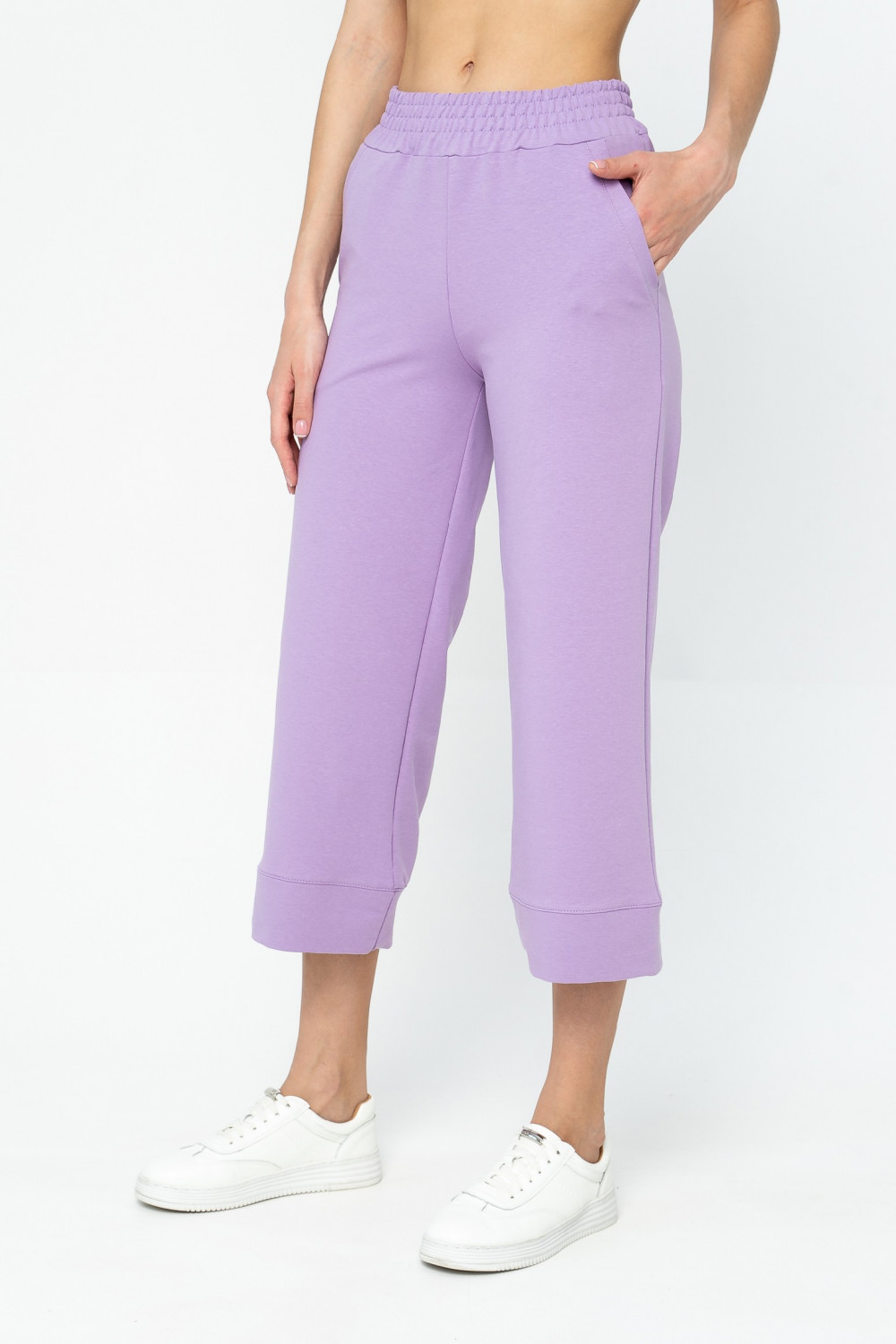 Стильные брюки-кюлоты длиной до середины колен отличаются легкостью и комфортным прилеганием к телу. Мягкая резинка на талии обеспечивает идеальную посадку. Брюки, прямые с карманами в боковом шве выполнены из мягкого хлопкового футера, что придает ему стильный образ, а заодно выгодно подчеркивает фигуру. Шов на передней половинке спереди и широкая манжета по низу брюк придают особый шик. Выглядит это очень эффектно и стильно. В комплекте с нашими джемперами из этой серии, футболкой или топом получается прекрасный костюм, который подходит как для дома, так и для прогулок и путешествий.
