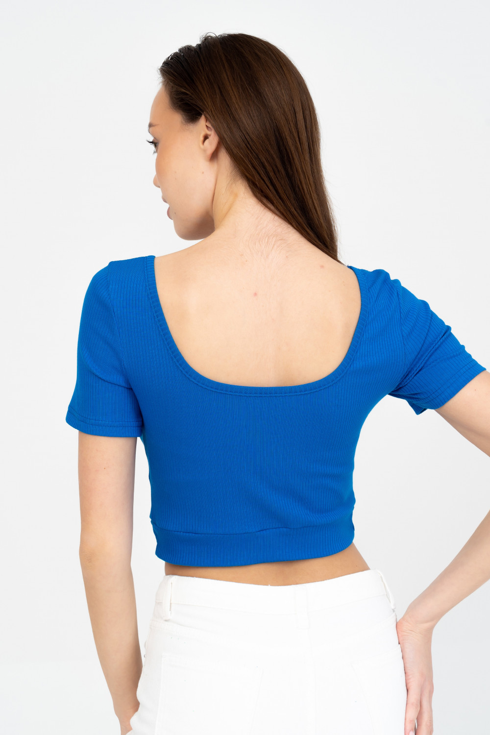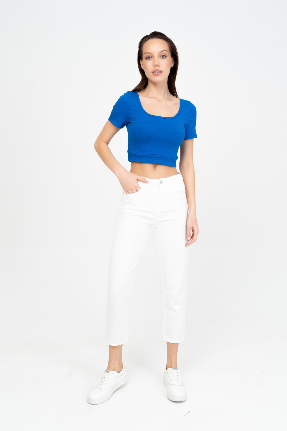 Укороченный джемпер из вискозы с лайкрой с красивым вырезом горловины. Рукава короткие втачные. Эффектный, яркий и одновременно базовый джемпер, который впишется в любой гардероб. Его можно носить как вспомогательный элемент, например под наши сарафаны, комбинезоны и даже свитшоты с глубоким вырезом горловины, так и самостоятельно.