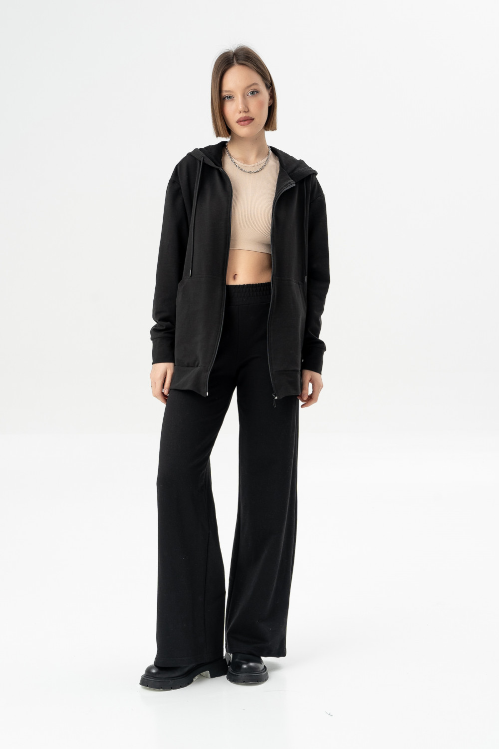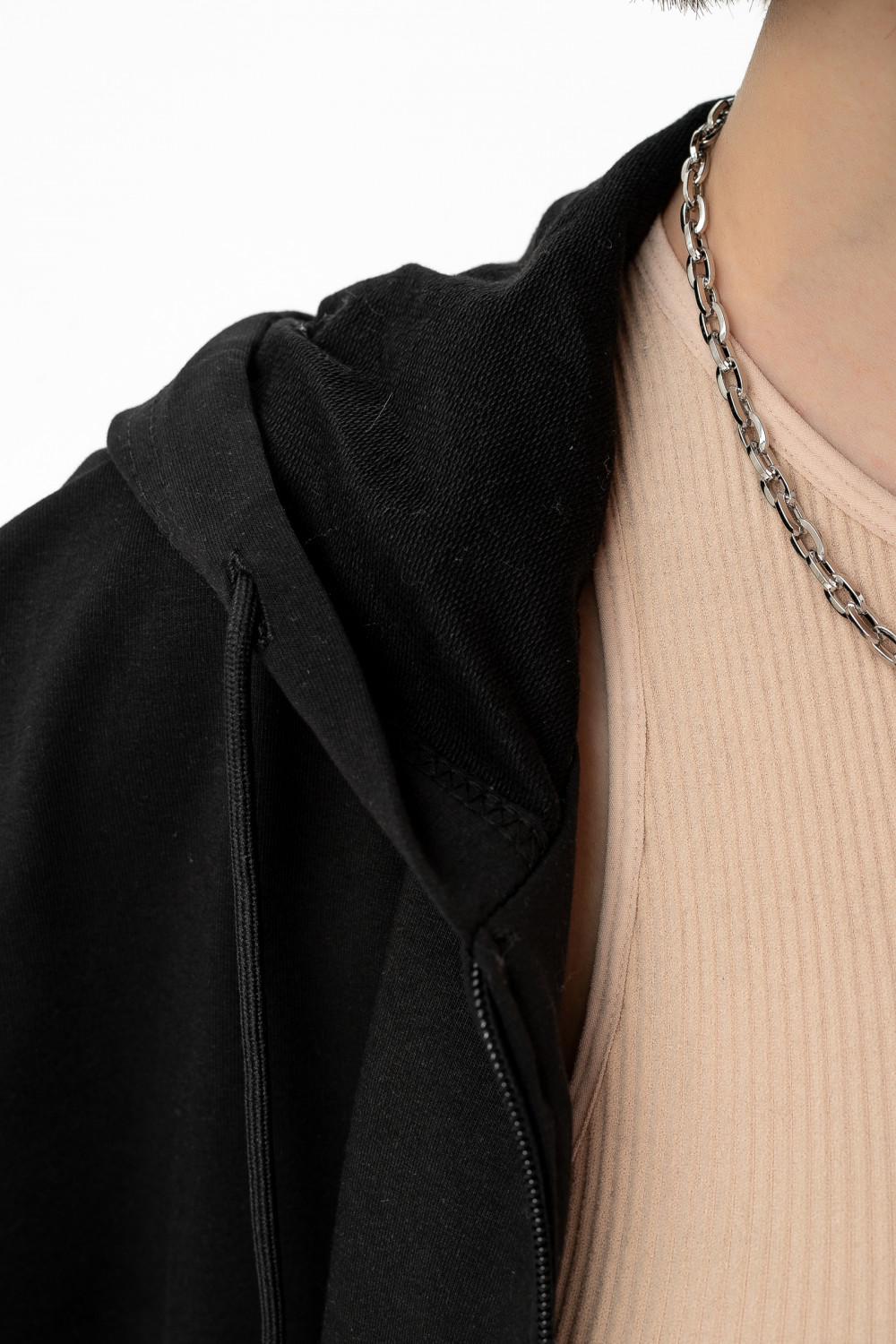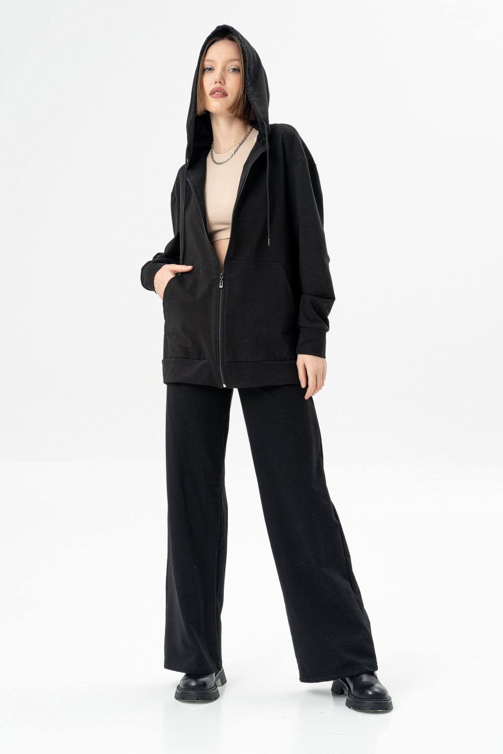 Куртка из мягкого хлопкового футера имеет капюшон на шнурке, карманы и манжеты на рукавах, благодаря чему модель смотрится стильно и модно. Рукава объемные со спущенным плечом. Идеальный вариант для тех, кто любит изделия с молнией.
