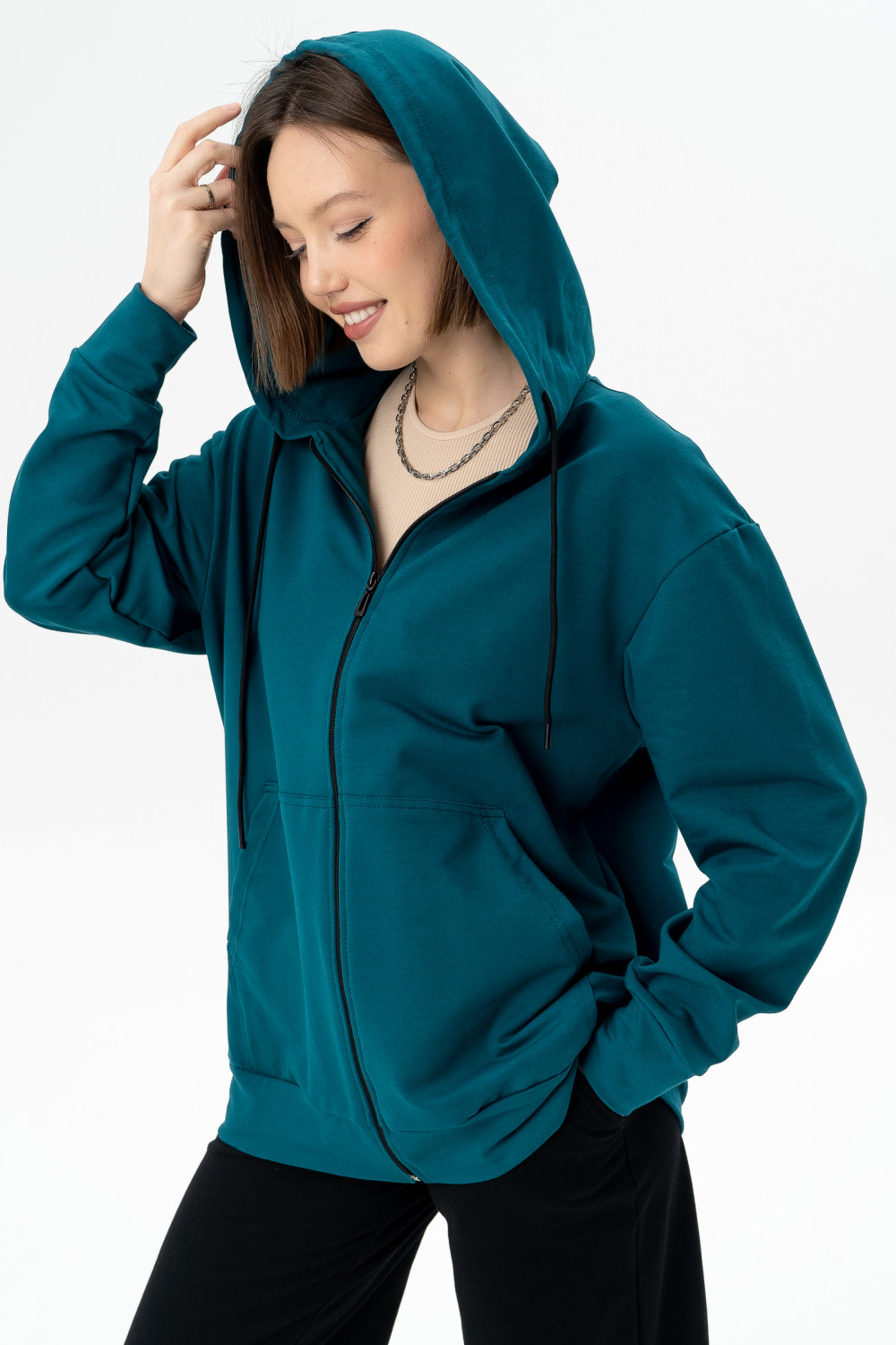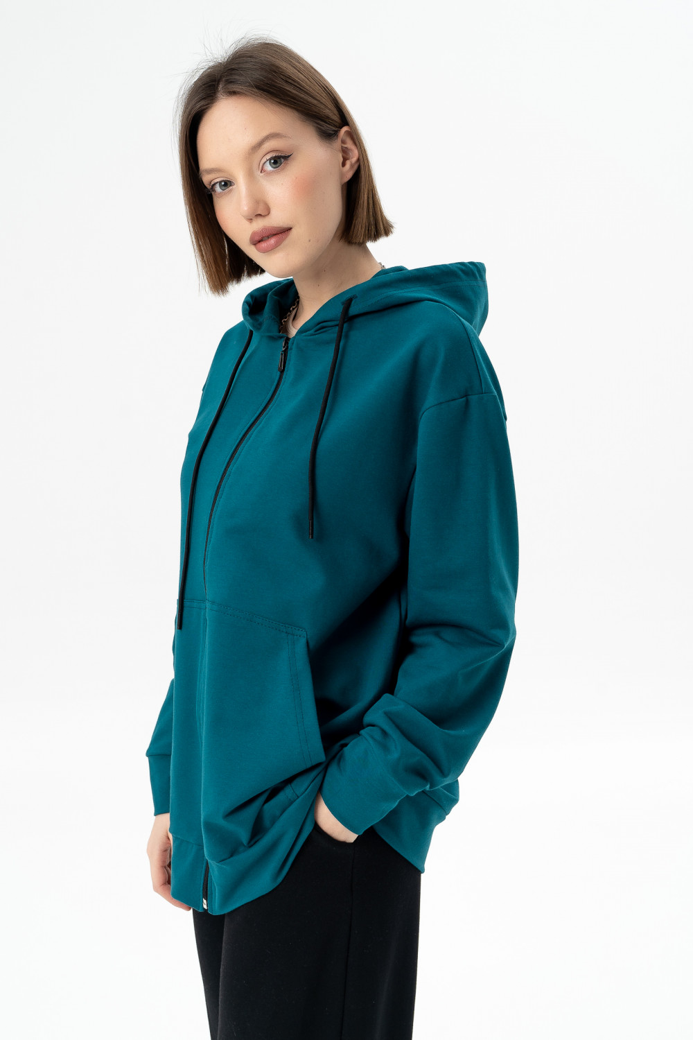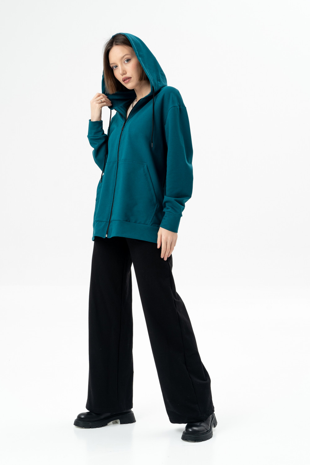 Куртка из мягкого хлопкового футера имеет капюшон на шнурке, карманы и манжеты на рукавах, благодаря чему модель смотрится стильно и модно. Рукава объемные со спущенным плечом. Идеальный вариант для тех, кто любит изделия с молнией.
