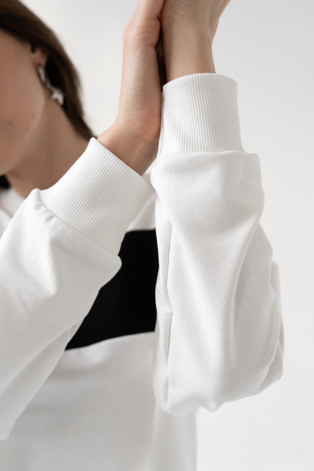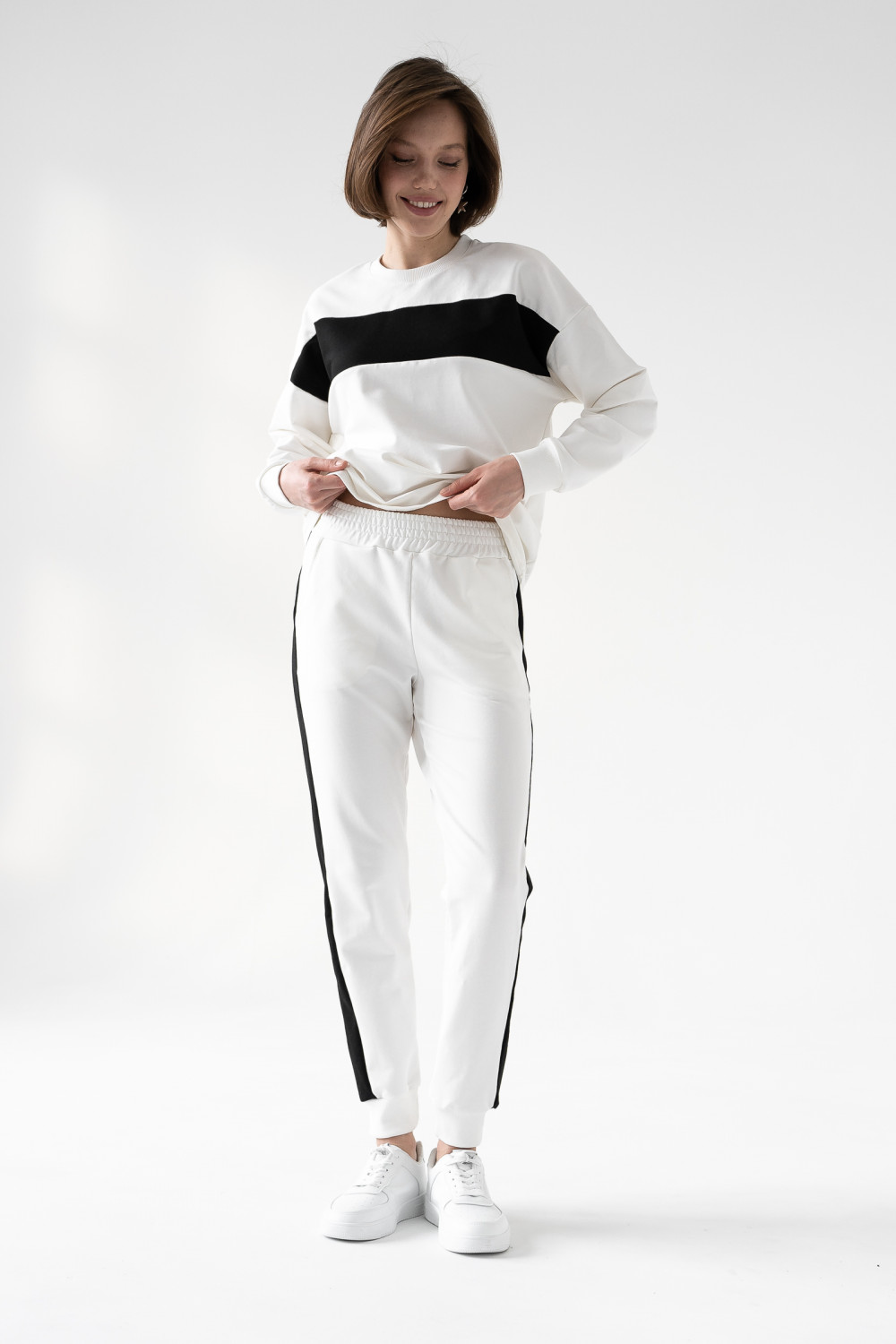 Мягкий уютный костюм из хлопкового футера. Свитшот прямого силуэта со спущенным плечом. Рукава объемные на манжете, горловина круглой формы из контрастного полотна, как на свитере. Брюки имеет широкие манжеты и удобные карманы. Контрастные лампасы на брюках визуально стройнят, а контрастная вставка на свитшоте придает изящества и игривости костюму.