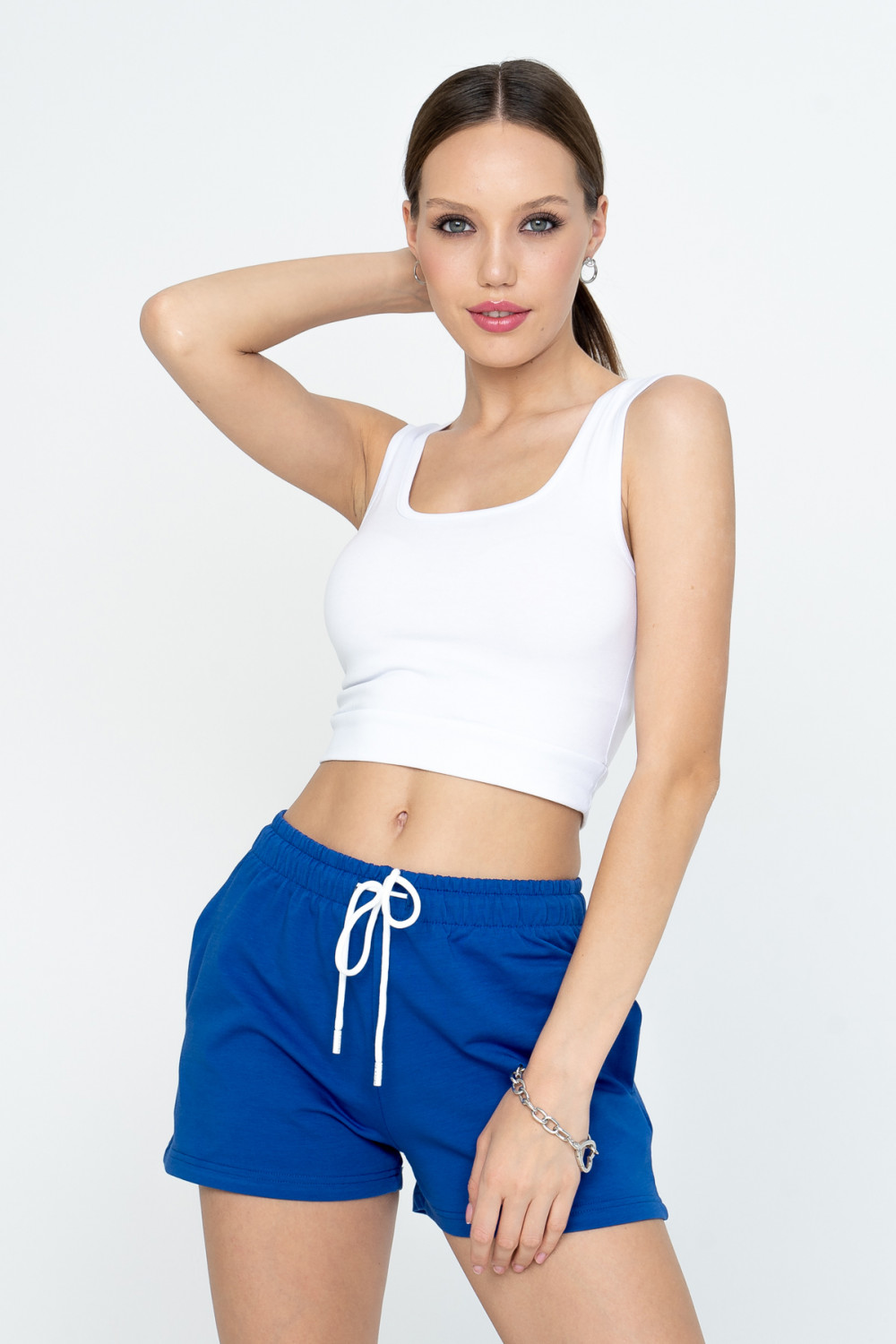 Лаконичные шорты с карманами отличаются легкостью и комфортным прилеганием к телу. Мягкая резинка на талии обеспечивает идеальную посадку. Шорты декорированы шнуром-завязкой, что придает ему стильный образ, а заодно выгодно подчеркивает фигуру. В сочетании с нашими джемперами из этой серии или нашими футболками получается прекрасный комплект, который подходит как для повседневной жизни, для прогулок и путешествий, так и для вечеринки. Получится образ в стиле «спорт шик».