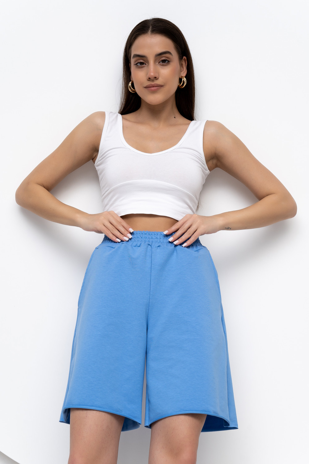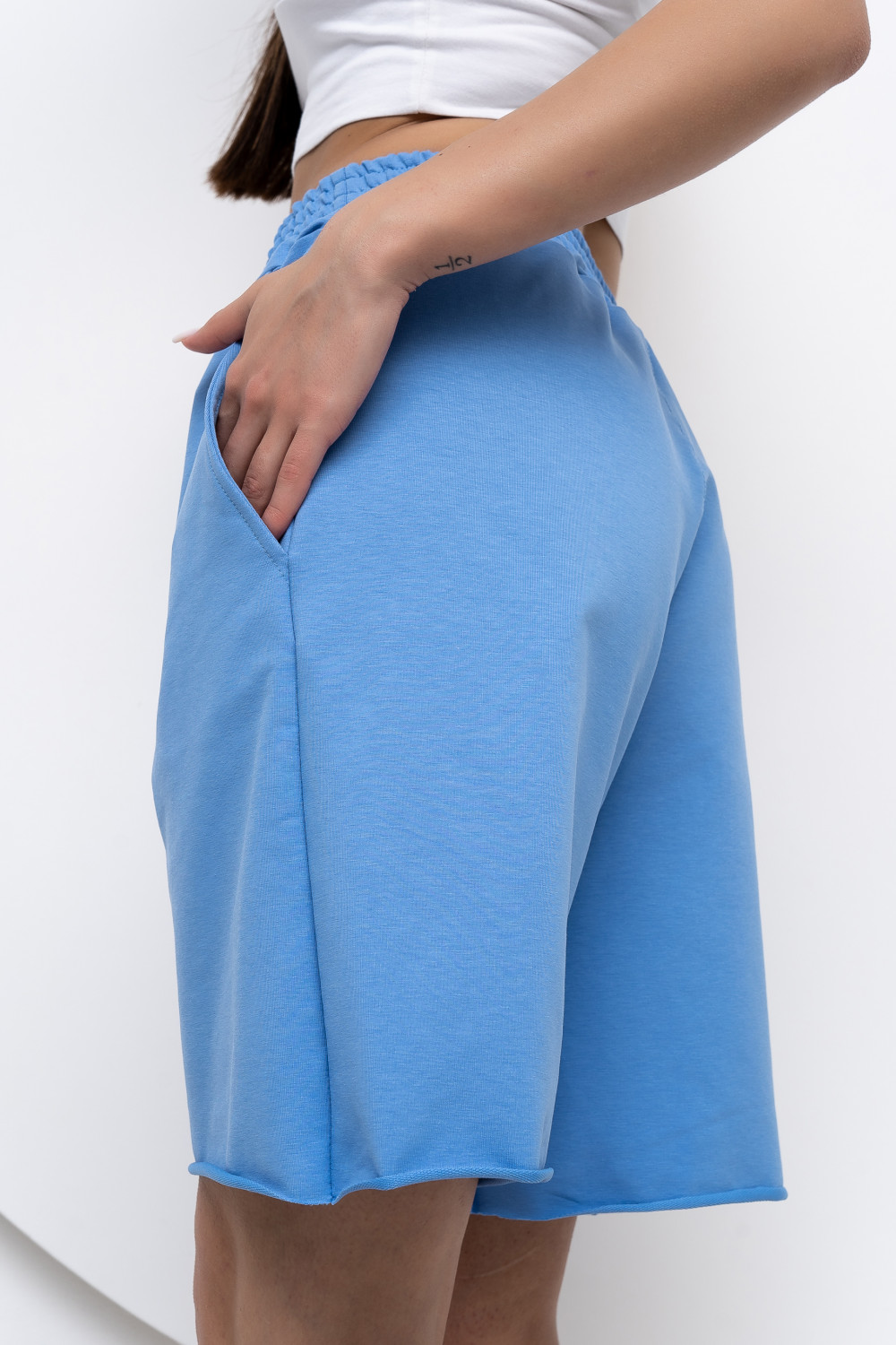 Шорты длиной чуть выше колена выполнены из хлопкового футера с высокой посадкой и карманами в боковых швах. Отстрочка по центру на передней половинке шорт придают особый шик. Выглядит это очень эффектно и стильно. Модель универсальна и сочетается, как с толстовками, свитшотами, так и с футболками.