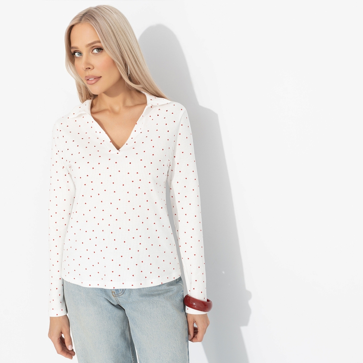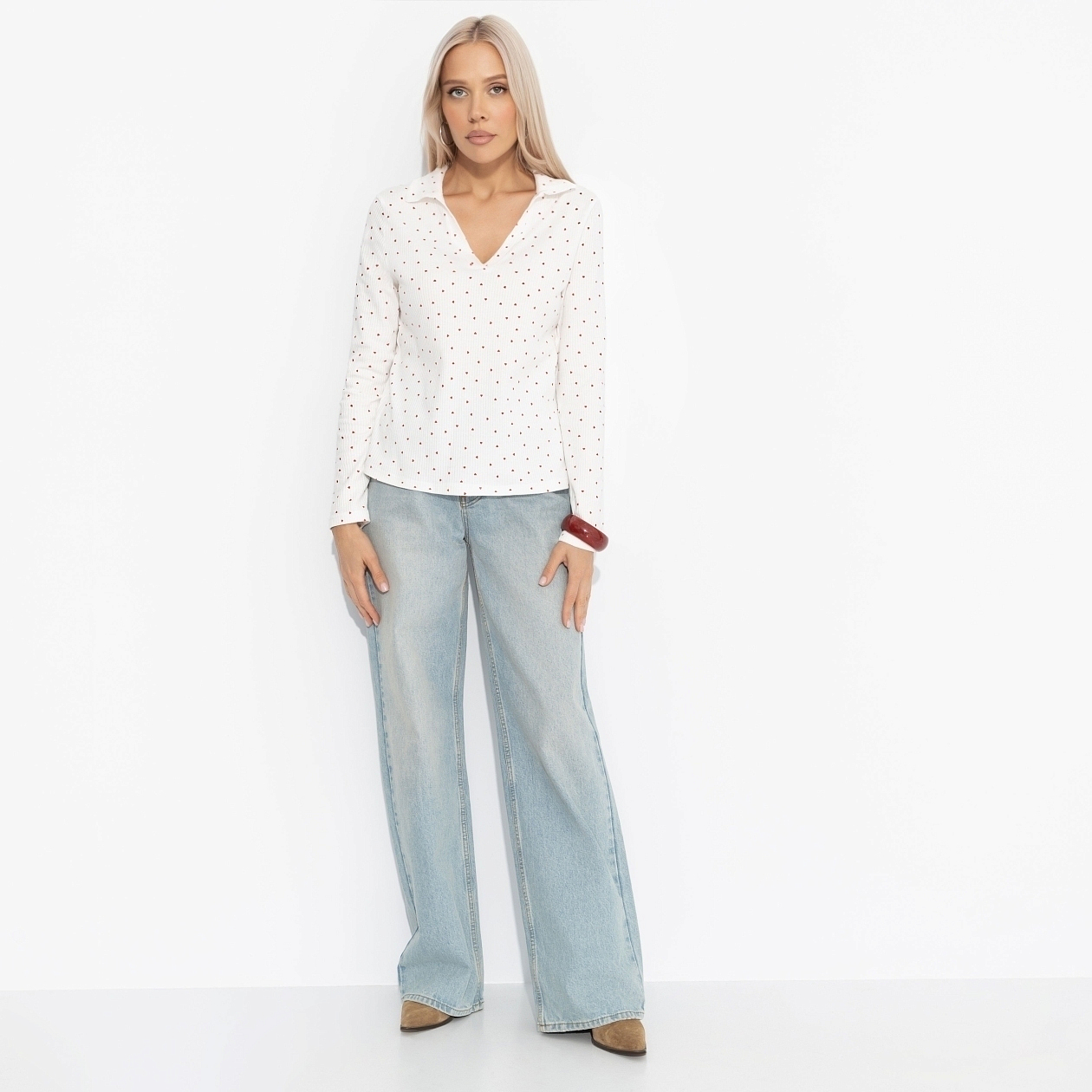 Она будто примерила на себя утро — нежное поло в мелкое сердечко. Поло ЧАРУТТИ – легкий намек на влюбленность в жизнь. В нём сложно суетиться. Только спокойная и тихая уверенность той, кто знает, что истинная роскошь говорит шепотом. Поло классического кроя. V-образный вырез ворота. Материал изделия в рубчик. Принт –мелкое сердечко, напечатан на ткани. Поло хорошо смотрится в заправленном виде и навыпуск.
