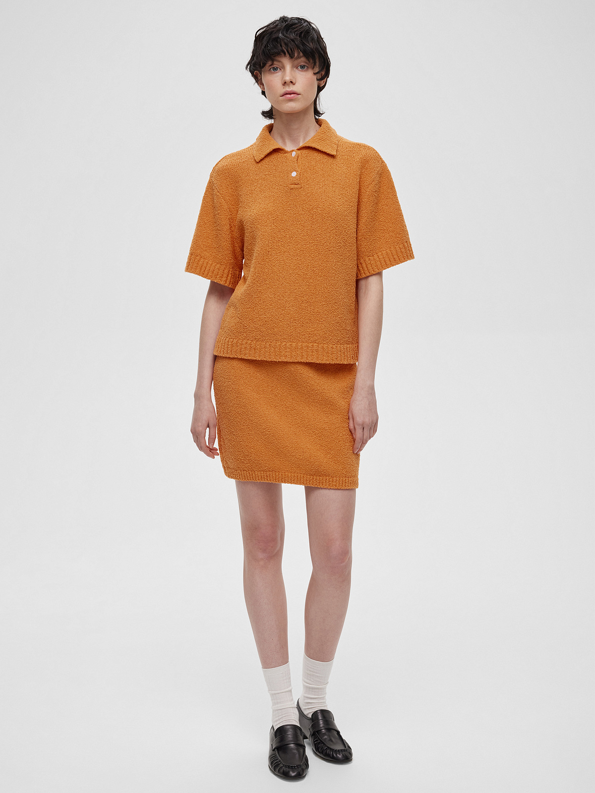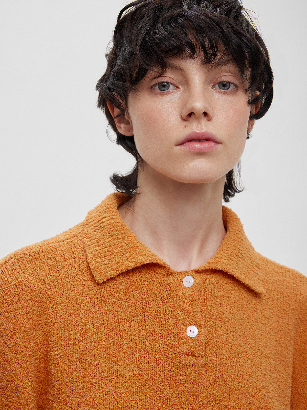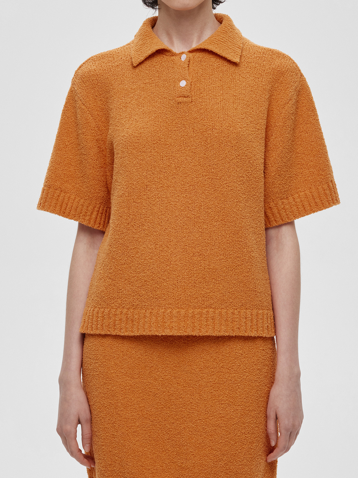 Поло с коротким рукавом, отложным воротником и застежкой на пуговицы по переду. Изготовлено из фактурной пряжи на хлопковой основе с эффектом букле.