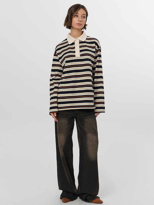 Женское поло с длинным рукавом в полоску создано для повседневной носки. Свободный крой со спущенным плечом не сковывает движения, а классическая застежка на три пуговицы удобна в использовании. Рукава и низ изделия аккуратно подогнуты и прошиты — это предотвращает растягивание ткани и сохраняет форму после стирок.