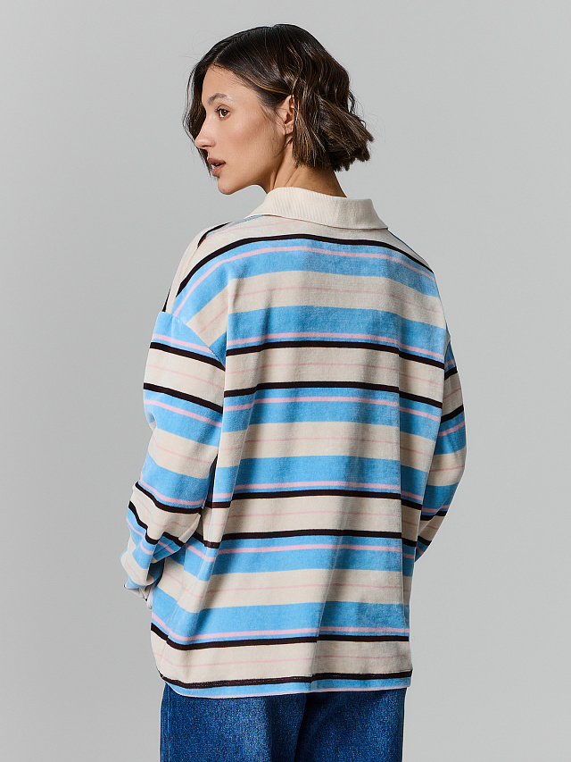 Поло в разноцветную полоску на молочном фоне — выбор для тех, кто ценит яркие детали и мягкий комфорт. Свободный прямой силуэт, спущенное плечо и длинные рукава создают расслабленный, современный образ. Классическая застёжка на пуговицы с планкой и аккуратным воротником добавляют модели лаконичную элегантность.