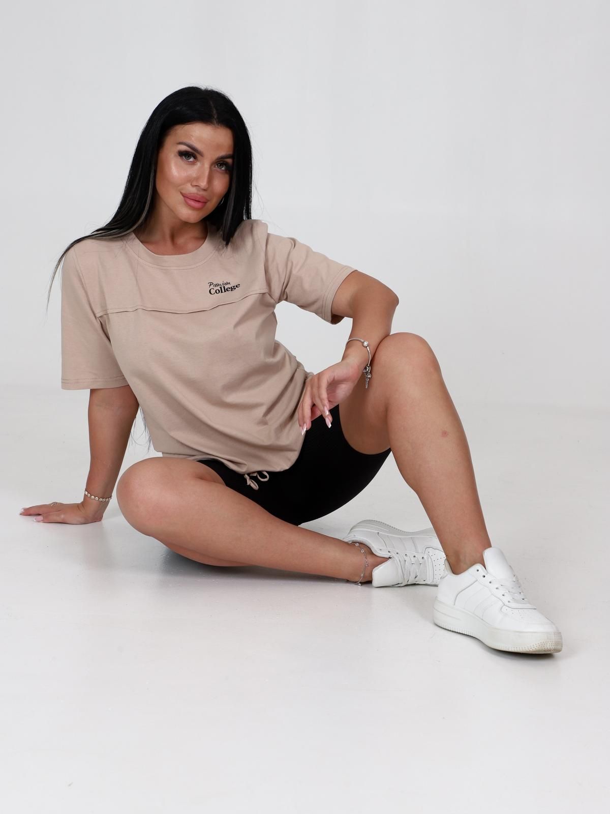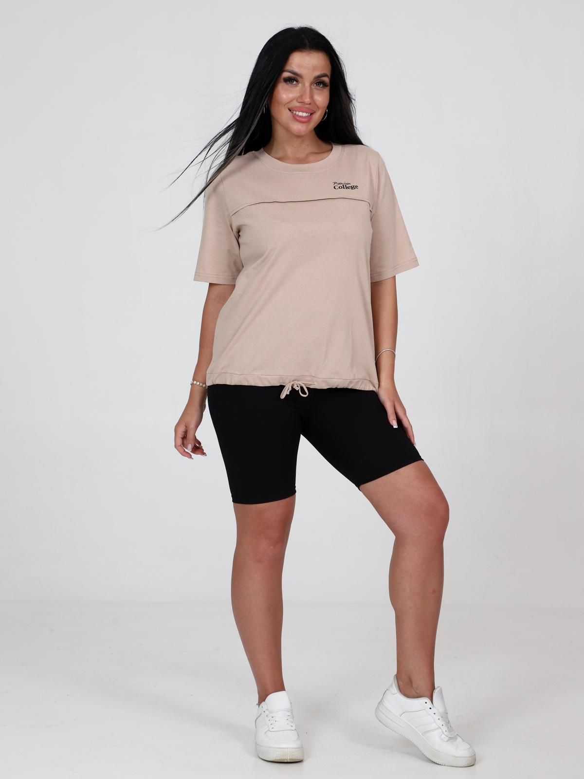 Базовая трикотажная футболка на каждый день. Отлично садится по фигуре любой комплектации. Модель прямого силуэта, с коротким рукавом, длиной до уровня бедер, по низу изделия утягивающая кулиска с завязками. Хорошо сочетается с любой одеждой.