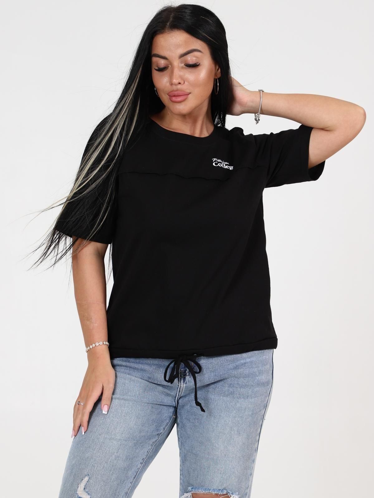 Базовая трикотажная футболка на каждый день. Отлично садится по фигуре любой комплектации. Модель прямого силуэта, с коротким рукавом, длиной до уровня бедер, по низу изделия утягивающая кулиска с завязками. Хорошо сочетается с любой одеждой.