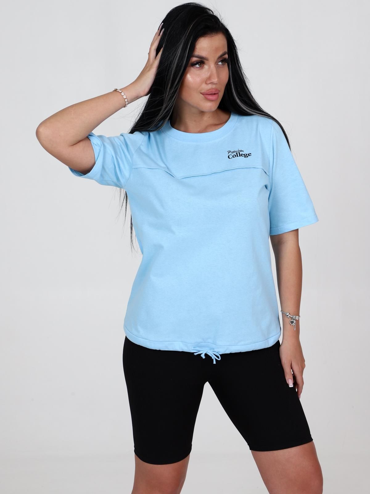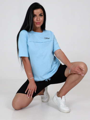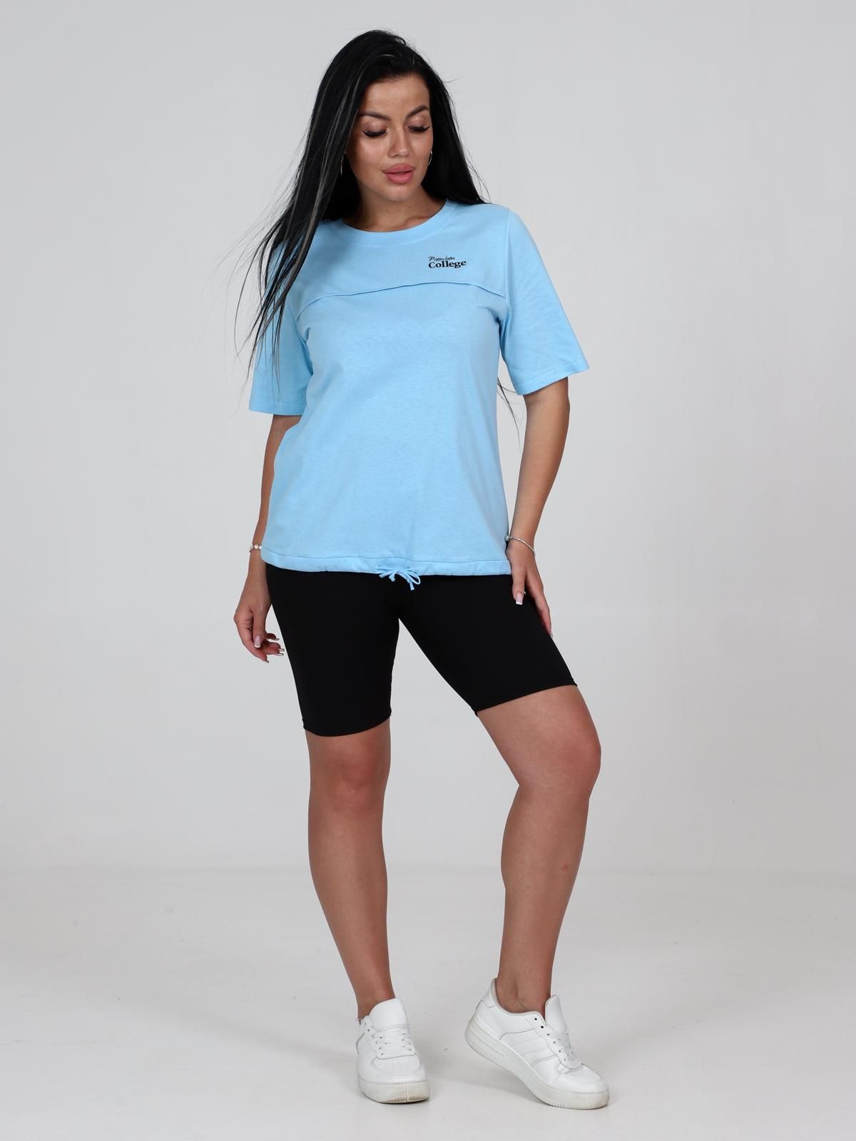 Базовая трикотажная футболка на каждый день. Отлично садится по фигуре любой комплектации. Модель прямого силуэта, с коротким рукавом, длиной до уровня бедер, по низу изделия утягивающая кулиска с завязками. Хорошо сочетается с любой одеждой.
