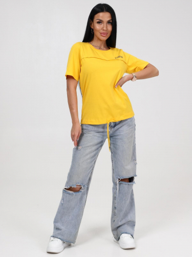 Базовая трикотажная футболка на каждый день. Отлично садится по фигуре любой комплектации. Модель прямого силуэта, с коротким рукавом, длиной до уровня бедер, по низу изделия утягивающая кулиска с завязками. Хорошо сочетается с любой одеждой.