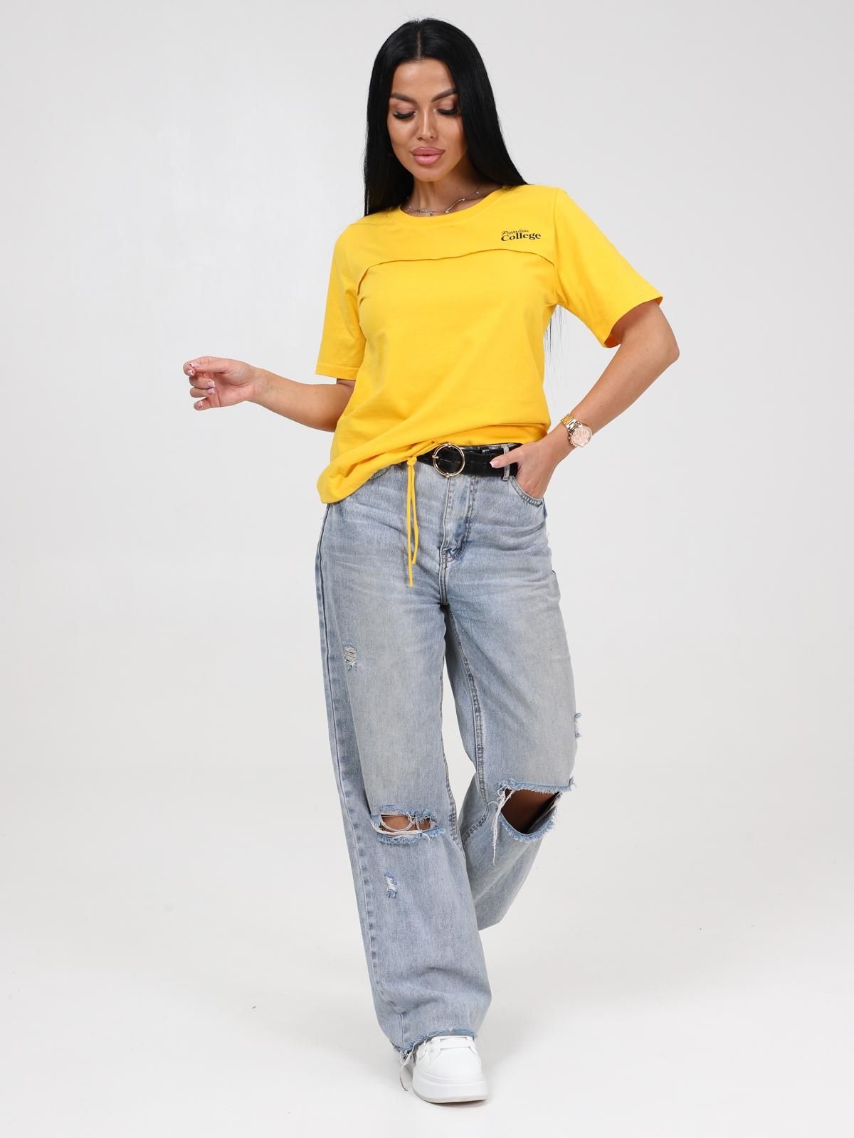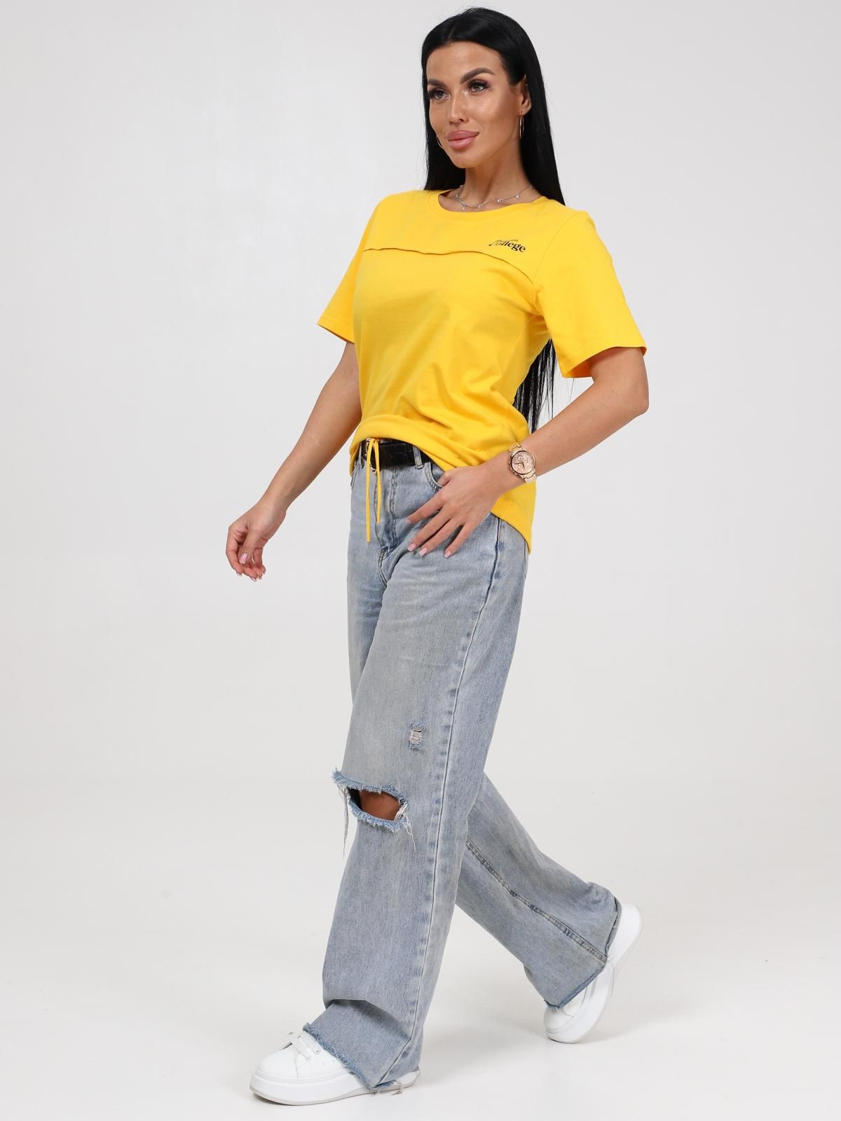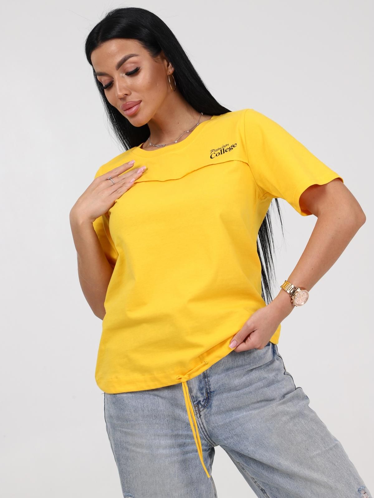 Базовая трикотажная футболка на каждый день. Отлично садится по фигуре любой комплектации. Модель прямого силуэта, с коротким рукавом, длиной до уровня бедер, по низу изделия утягивающая кулиска с завязками. Хорошо сочетается с любой одеждой.