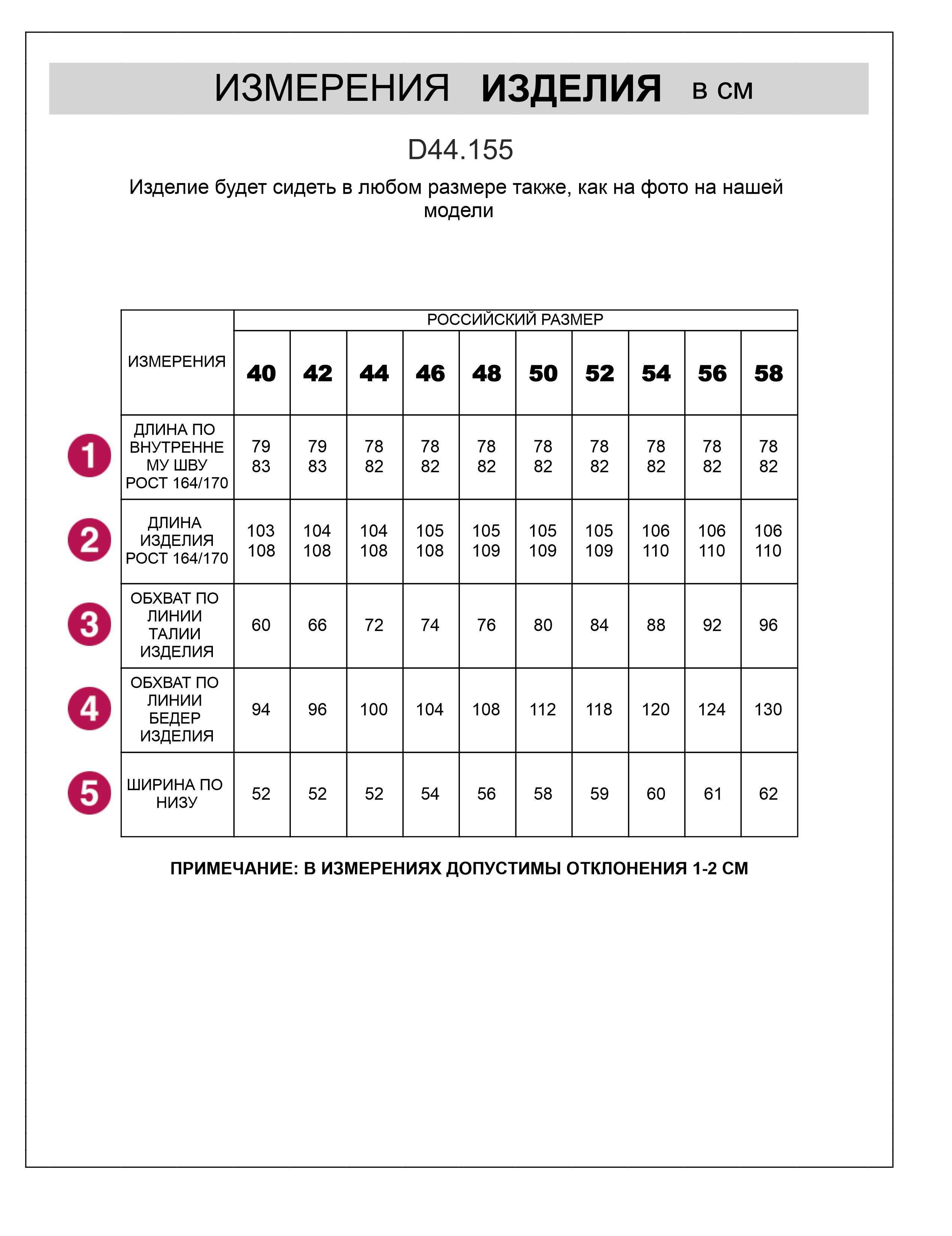 Прямые брюки выполнены из трикотажа джерси средней плотности. Модель дополнена боковыми карманами и поясом на резинке сзади. Заутюженные стрелки визуально вытягивают силуэт. Изделие хорошо держит форму, отлично тянется и почти не мнется во время использования. Идеальный вариант в офис или в повседневный классический стиль.