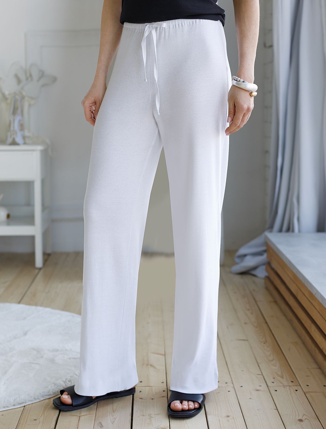 Прямые брюки белого цвета с поясом на тонкой резинке из фактурного трикотажа в рубчик созданы для вашего ежедневного комфорта. Особенность полотна - трикотаж кашкорсе удивительной мягкости, намного мягче стандартных вариантов, подходящий для расслабленных домашних и пижамных образов. Хлопок обеспечивает максимальный комфорт даже в течение длительного времени и позволяет коже дышать, а эластан дарит безупречную посадку на различные типы фигуры, в том числе и большие размеры и позволяет свободно двигаться. Выбирая эти легкие штаны, вы получаете удобство и стиль в одном решении, ведь домашние и повседневные задачи будут проходить с максимальным комфортом. Красивые брюки сохранят свой внешний вид даже при активной эксплуатации, ткань не теряет форму. Брюки подходят для создания уютного образа на каждый день, легко сочетаются с другими предметами гардероба для прогулок и уютных вечеров. Приятная рельефная фактура ткани и аккуратный дизайн создают баланс между стилем и удобством, что особенно важно при выборе повседневных брючек.