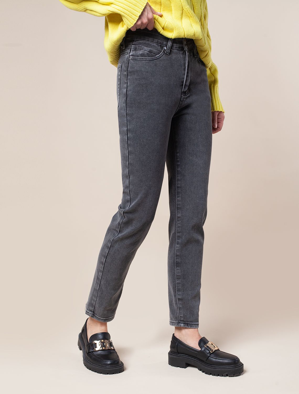 Джинсы прямого силуэта сшиты из эластичного денима средней плотности. Универсальные и практичные для любого времени года с кроссовкамии, туфлями и сапогами. На верх с классической блузкой, водолазкой и свитером крупной вязки.