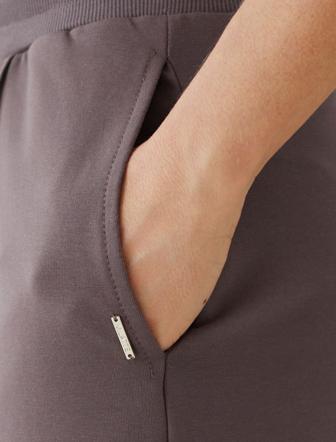 Брюки актуального кофейного цвета прямого кроя выполнены из премиального футера-двухнитки. Лаконичный силуэт поддерживают застроченные стрелки, зрительно вытягивающие силуэт. Удобный пояс на резинке регулируется хлопковым шнурком с золотистой фурнитурой. Наличие эластана в составе изделия гарантирует комфорт и долговечность изделия. Эластичный материал хорошо пропускает воздух, позволяя телу дышать, и легко тянется, не ограничивая движения.