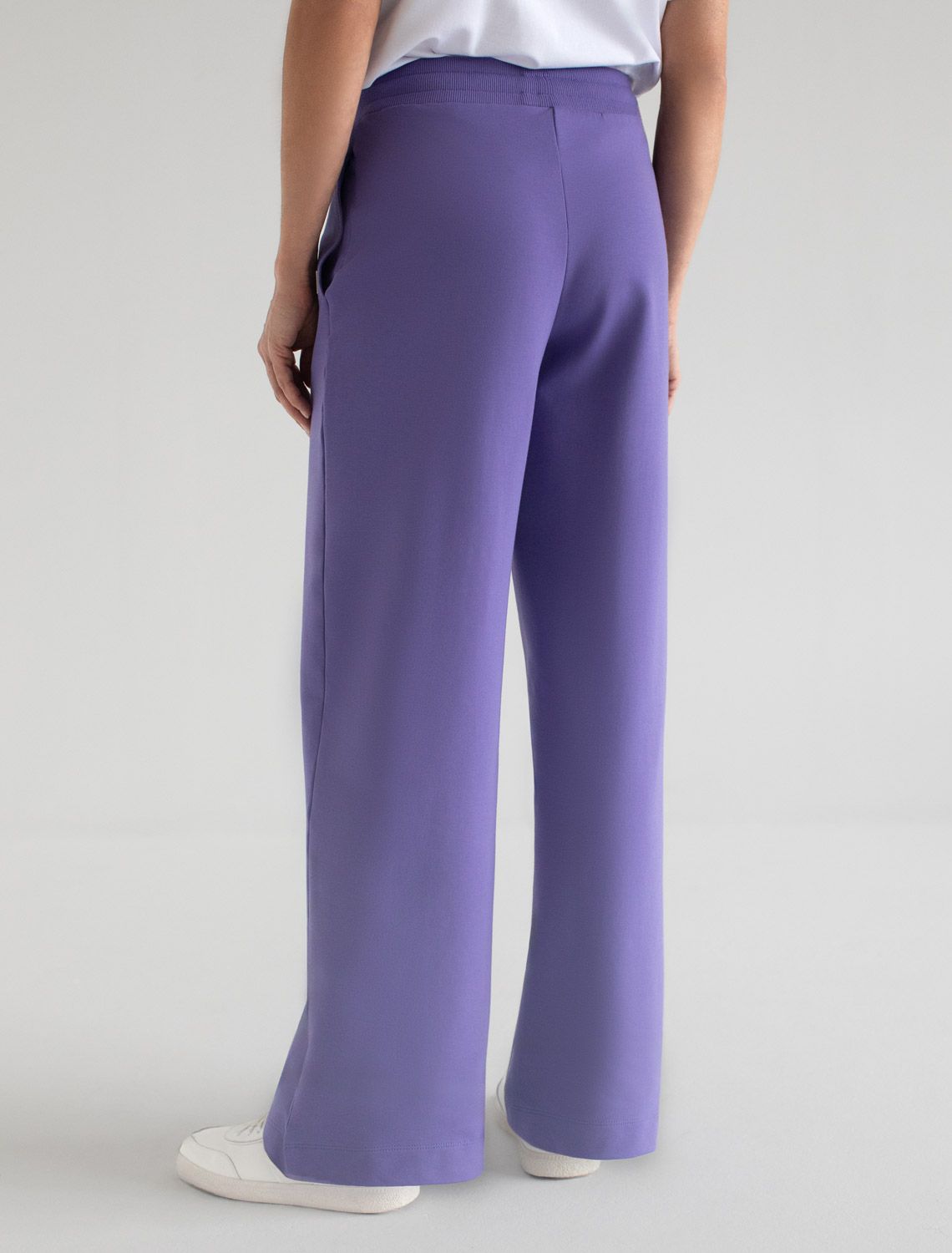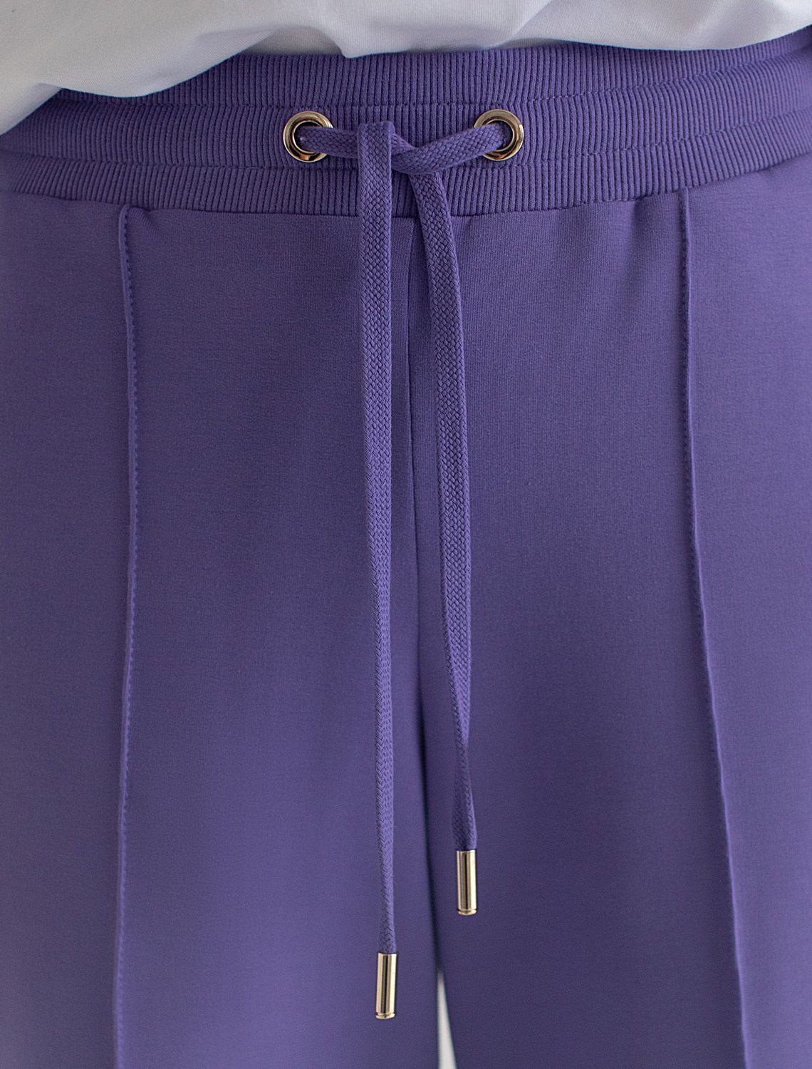 Брюки лавандового цвета прямого кроя выполнены из премиального футера-двухнитки. Лаконичный силуэт поддерживают застроченные стрелки, зрительно вытягивающие силуэт. Удобный пояс на резинке регулируется хлопковым шнурком с золотистой фурнитурой. Наличие эластана в составе изделия гарантирует комфорт и долговечность изделия. Эластичный материал хорошо пропускает воздух, позволяя телу дышать, и легко тянется, не ограничивая движения.