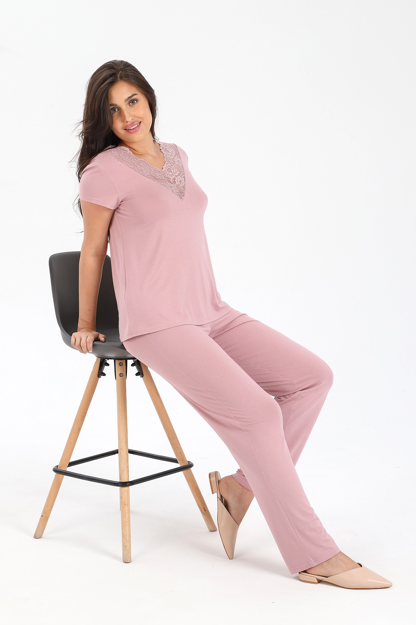 Пижама из гладкокрашеного вискозного трикотажного полотна, состоящая из футболки и брюк. Футболка - слегка расширенная книзу, с короткими втачными рукавами. Полочка и спинка – с V – образными кружевными деталями по горловине.
