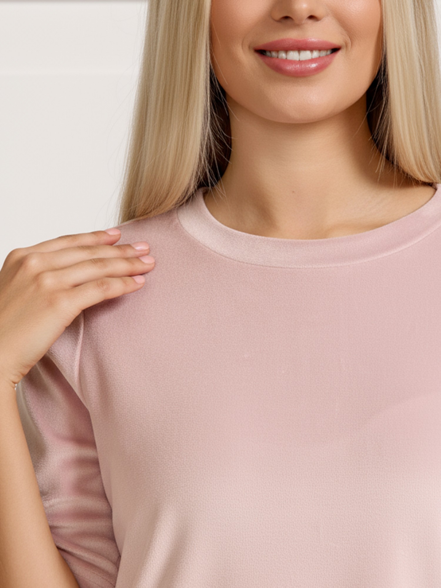 Туника женская из гладкокрашенного полотна «велюр стрейч», свободного покроя, с короткими втачными рукавами, горловиной овальной формы, обработанной втачной планкой и разрезами в боковых швах.