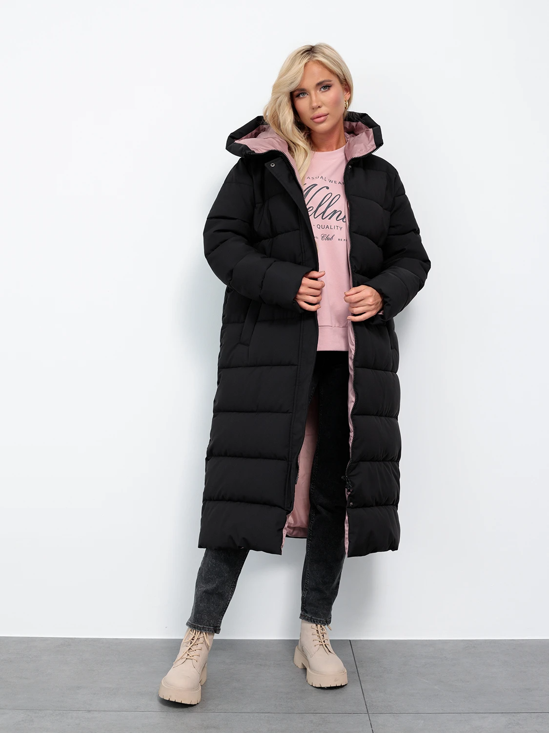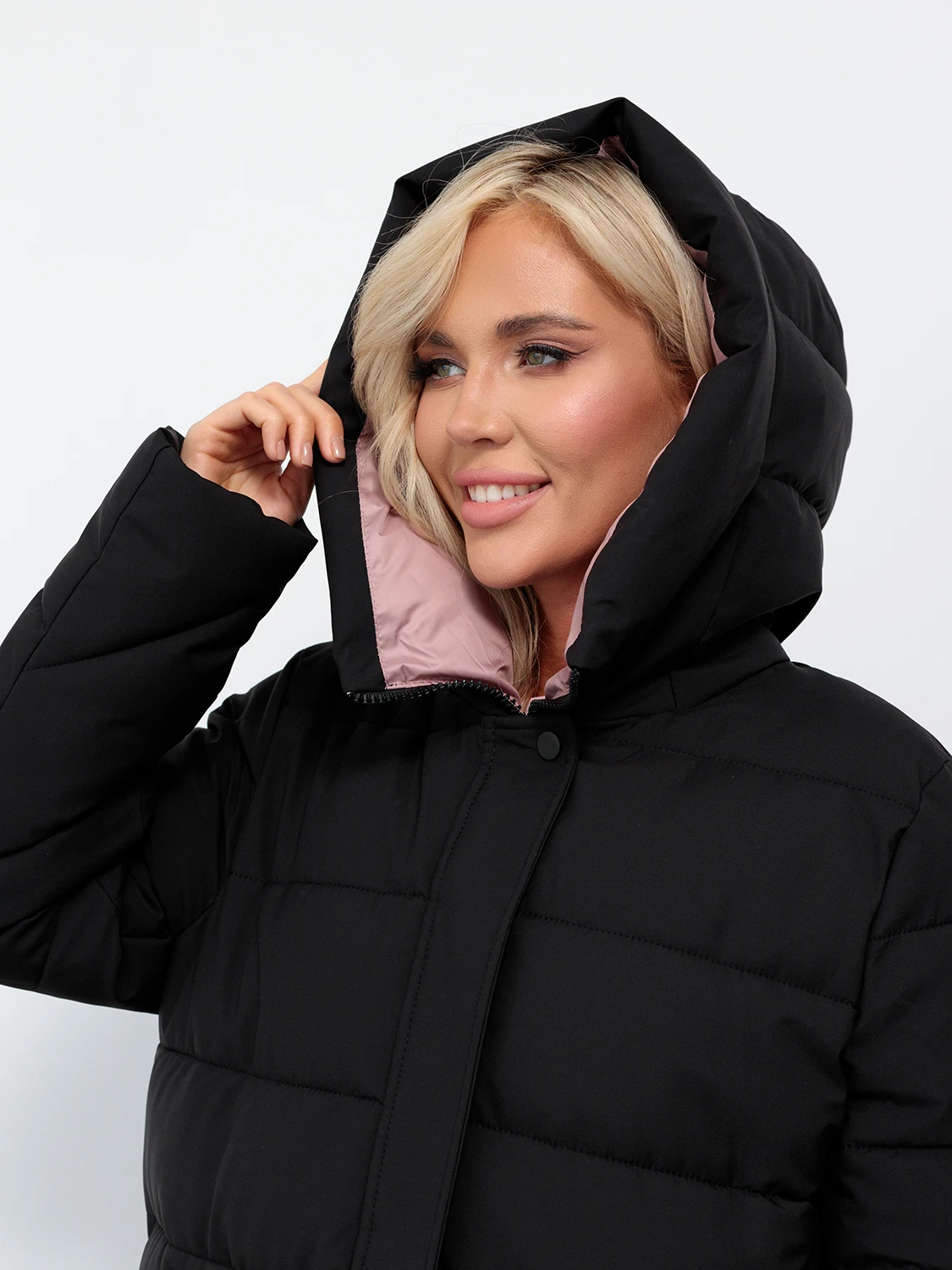 Длинный стильный пуховик прямого кроя с глубоким капюшоном.